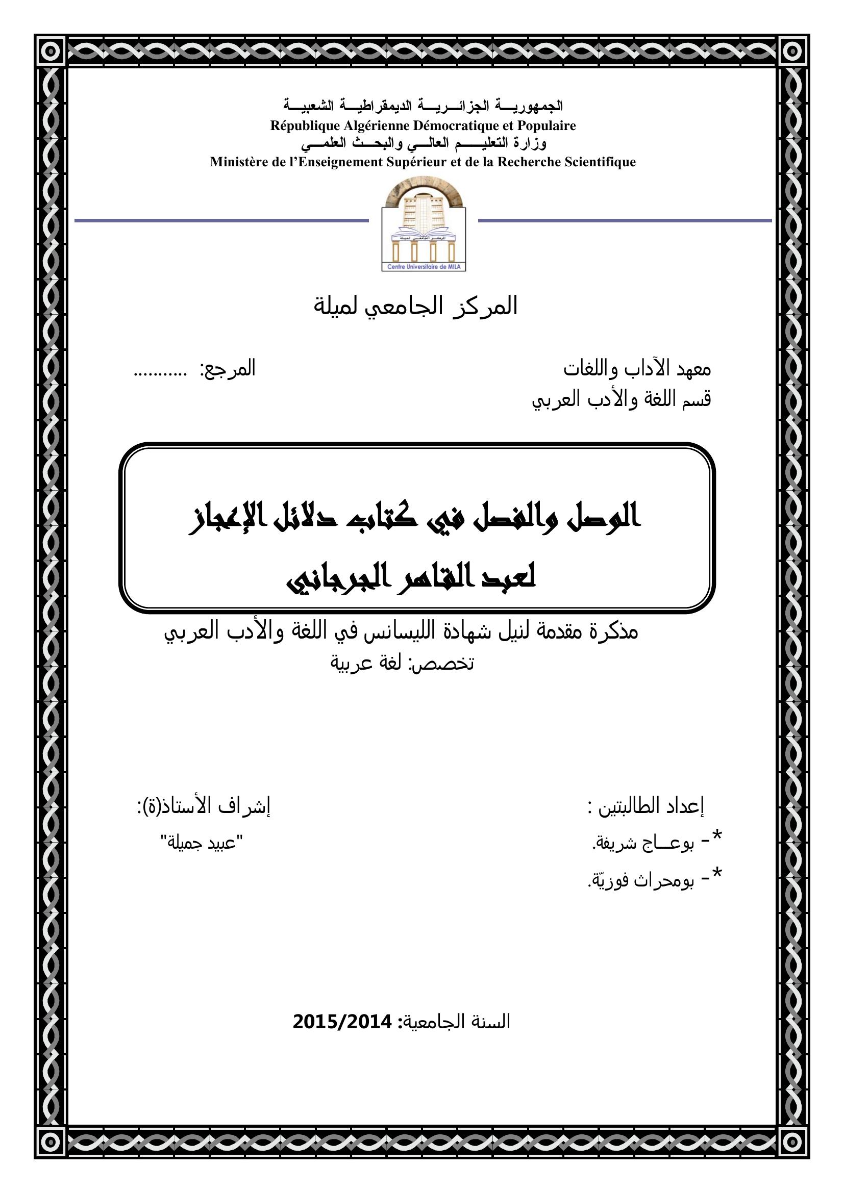بومحراث فوزية et al. (2015). الوصل والفصل قي كتاب دلائل الإعجازلعبد القاهر الجرجاني.