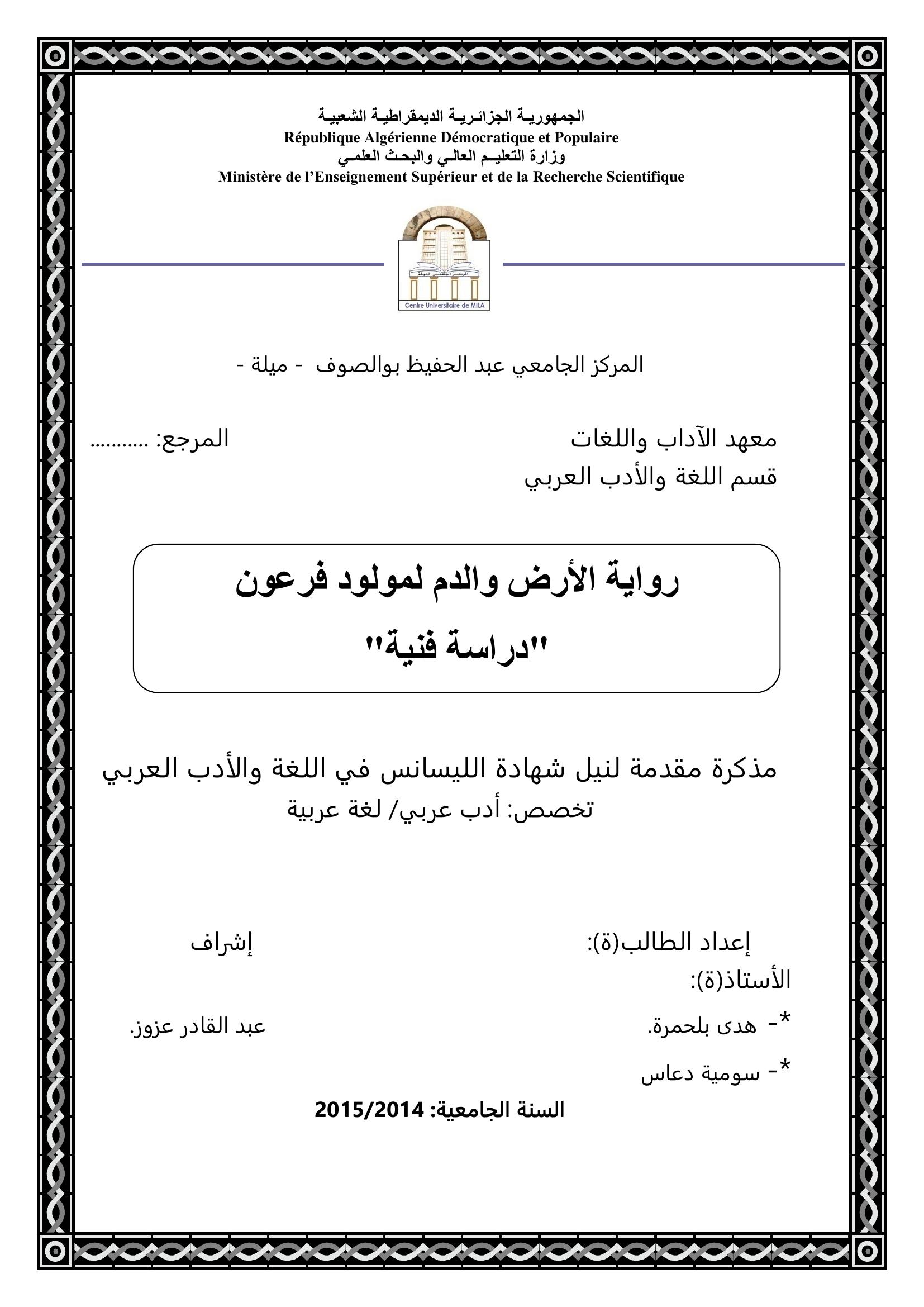 بلحمرة هدى et al. (2015). رواية الأرض والدم لمولود فرعون دراسة فنية.