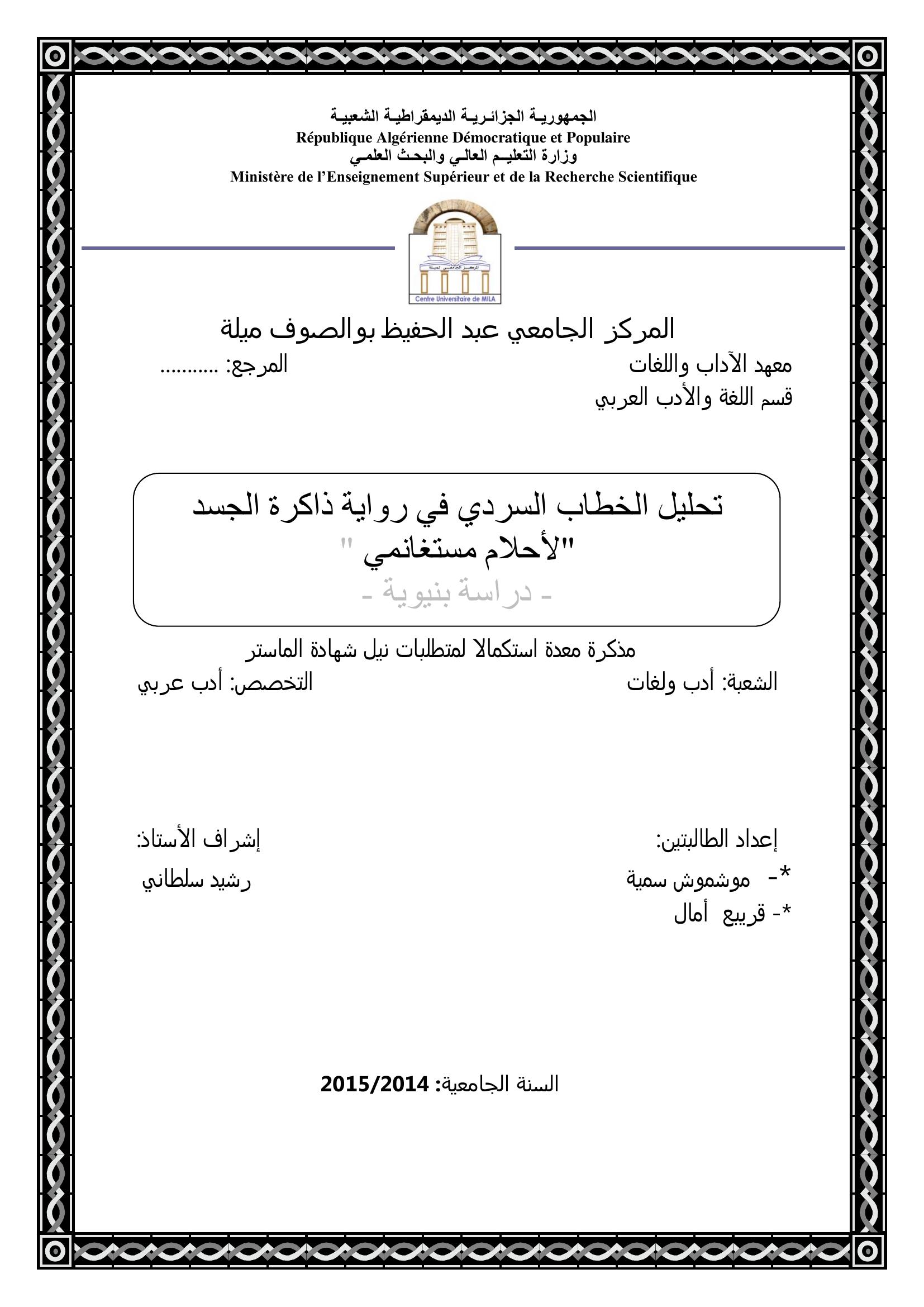 موشموش سمية et al. (2015). تحليل الخطاب السردي في رواية ذاكرة الجسد لأحلام مستغانمي.