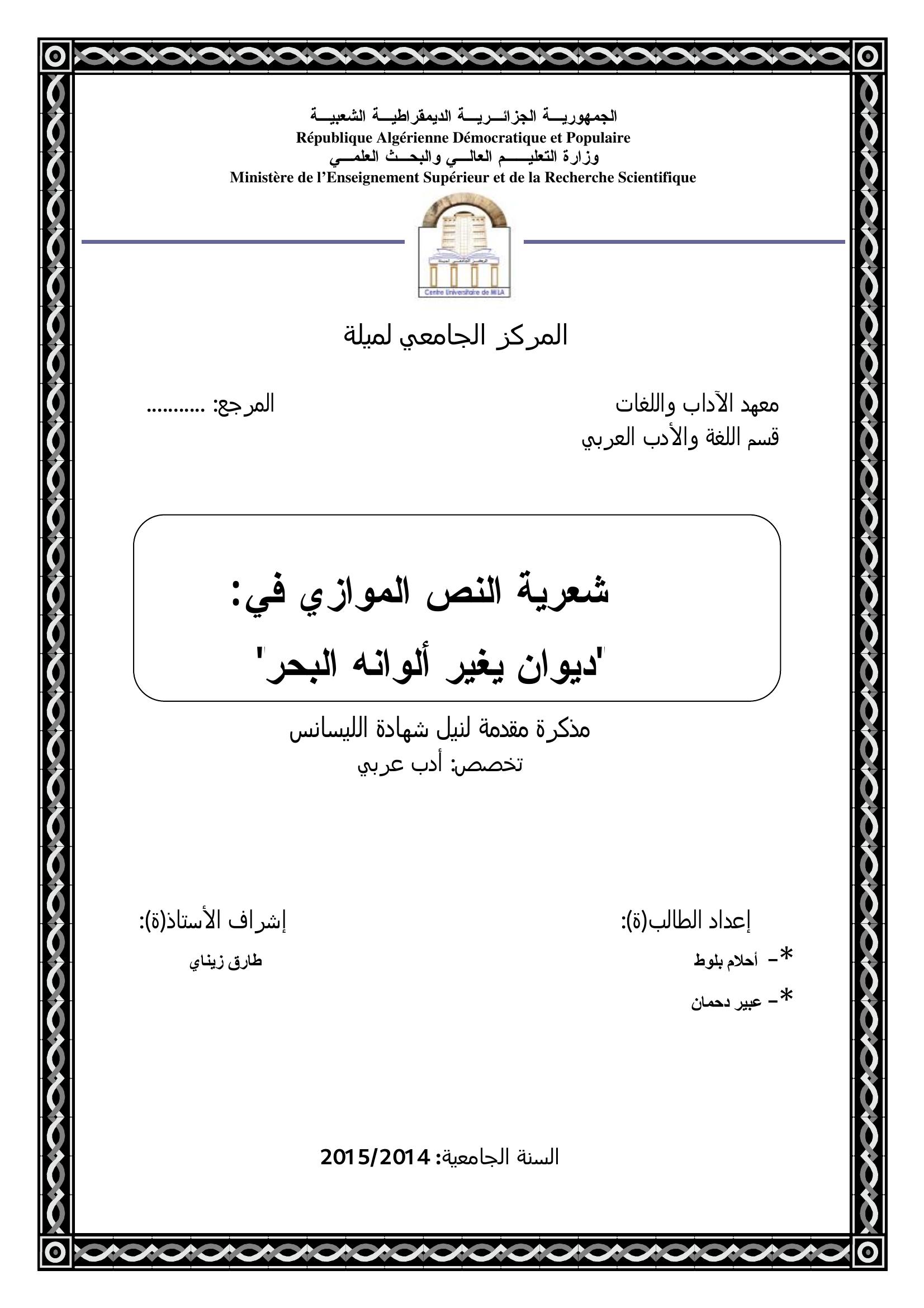 بلوط أحلام et al. (2015). شعرية النص الموازي في ديوان يغير ألوانه البحر.