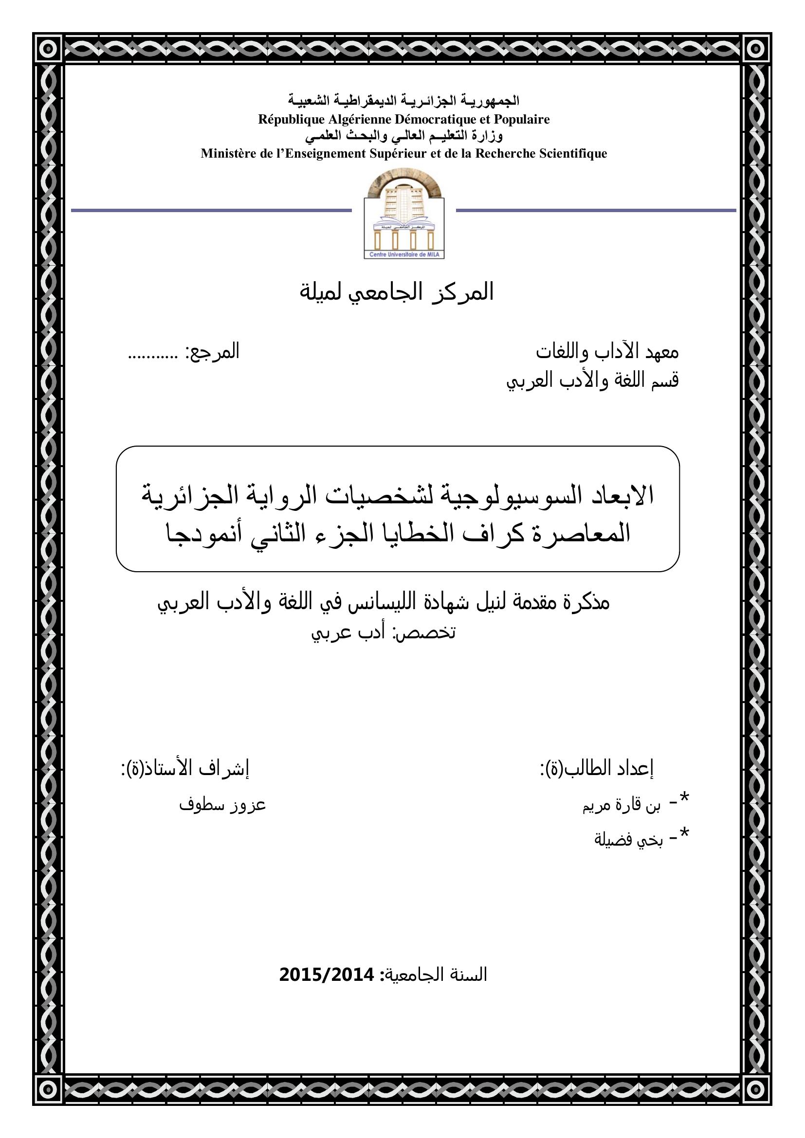 بن قارة مريم et al. (2015). الأبعاد السوسيولوجية لشخصيات الرواية الجزائرية المعاصرة كراف الخطايا الجزء الثاني أنموذجا.