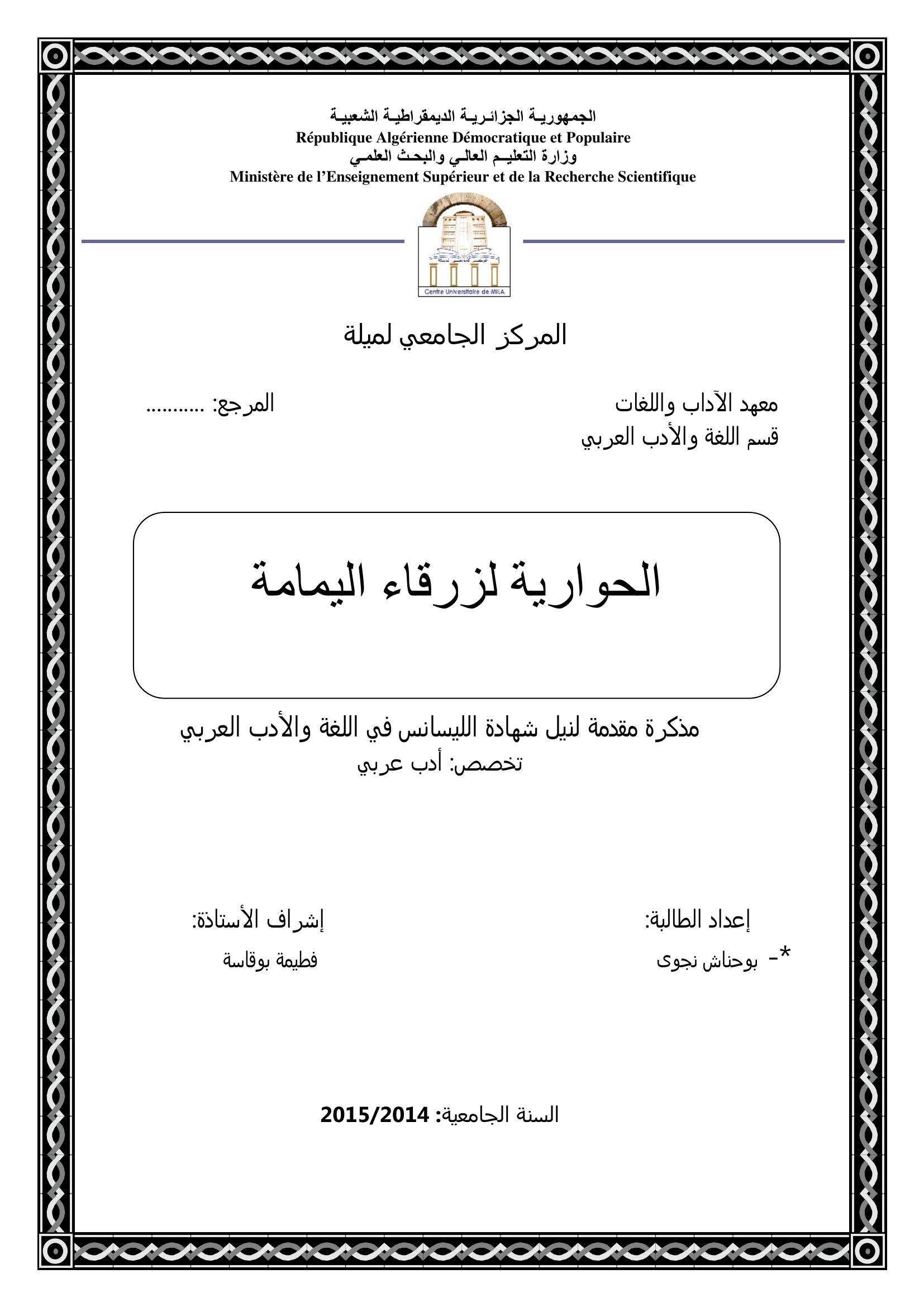 بوحناش نجوى & بوقاسة فطيمة ( مشرفا) (2015). الحوارية في زرقاء اليمامة لأمل دنقل أنموذجا.
