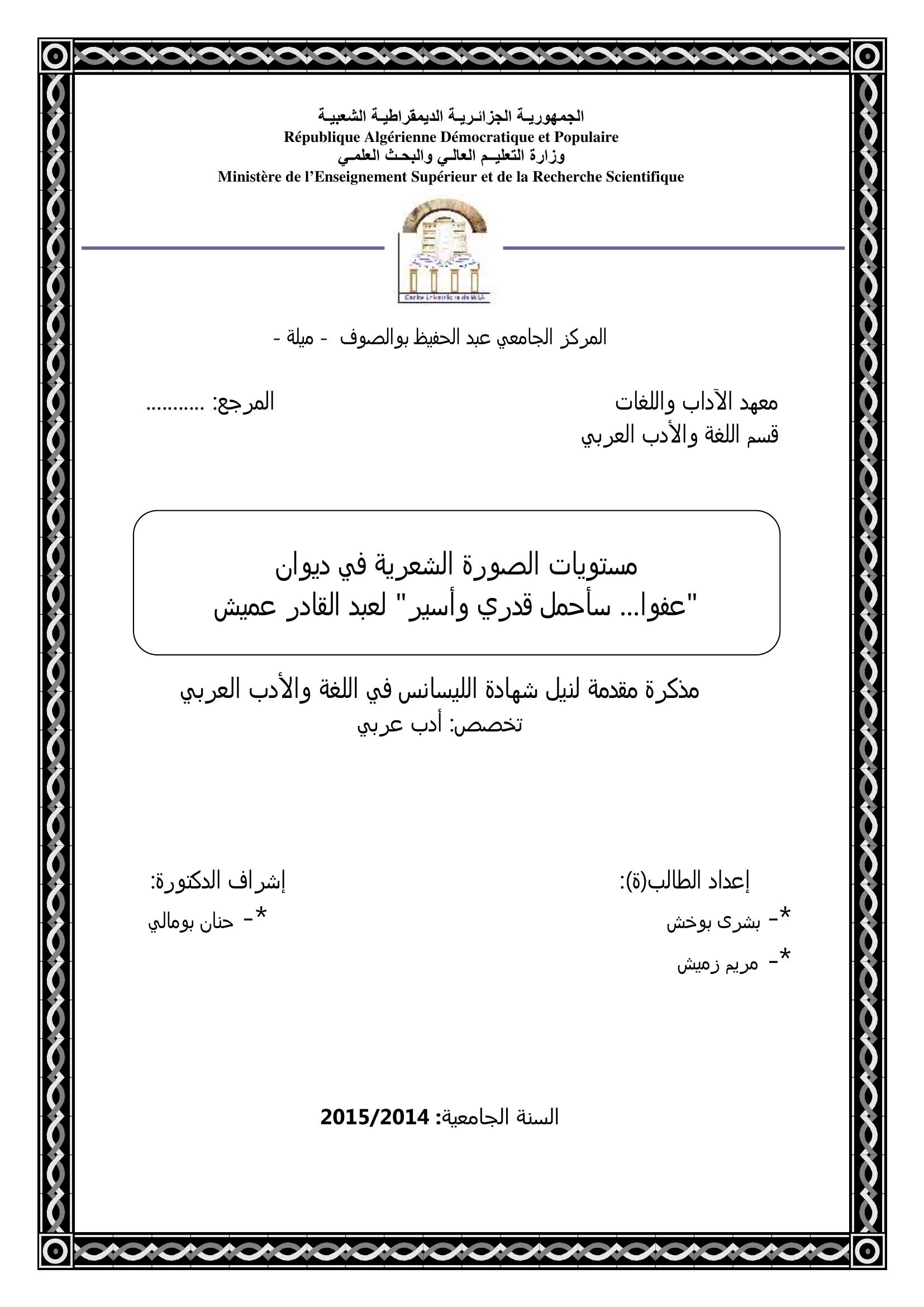 بوخش بشرى et al. (2015). مستويات الصورة الشعرية في ديوان عفوا سأحمل قدري وأسير لعبد القادر عميش.