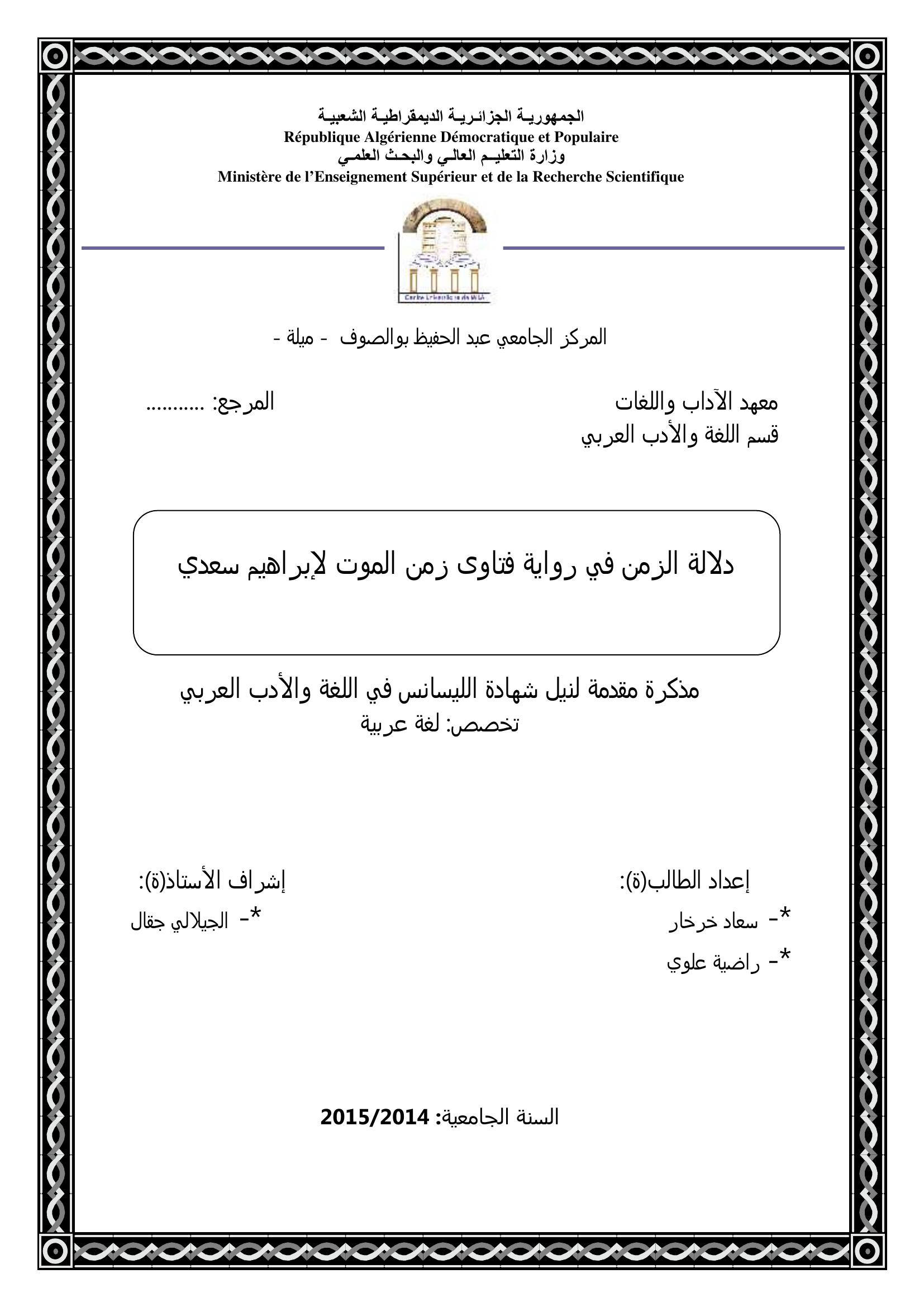 خرخار سعاد et al. (2015). دلالة الزمن في رواية فتاوى زمن الموت لابراهيم سعدي.
