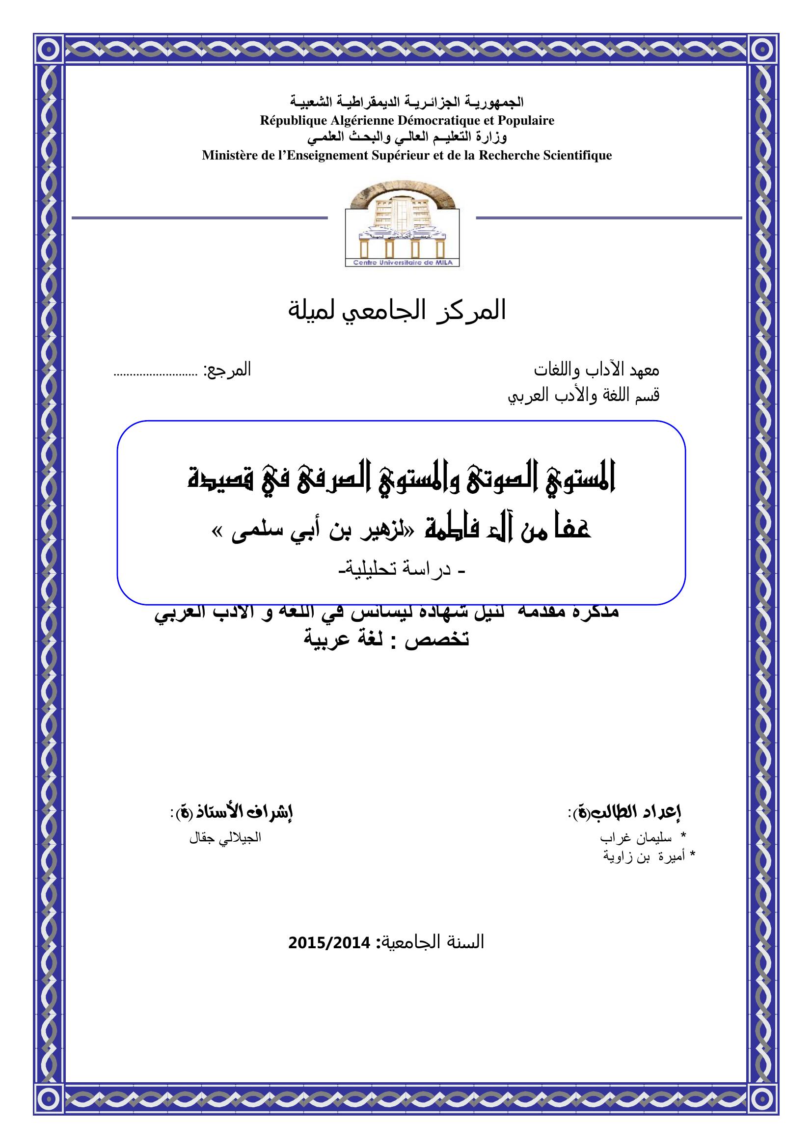 غراب سليمان et al. (2015). المستوى الصوتي والمستوى الصرفي في قصيدة عفا من آل فاطمة لزهير بن أبي سلمى.