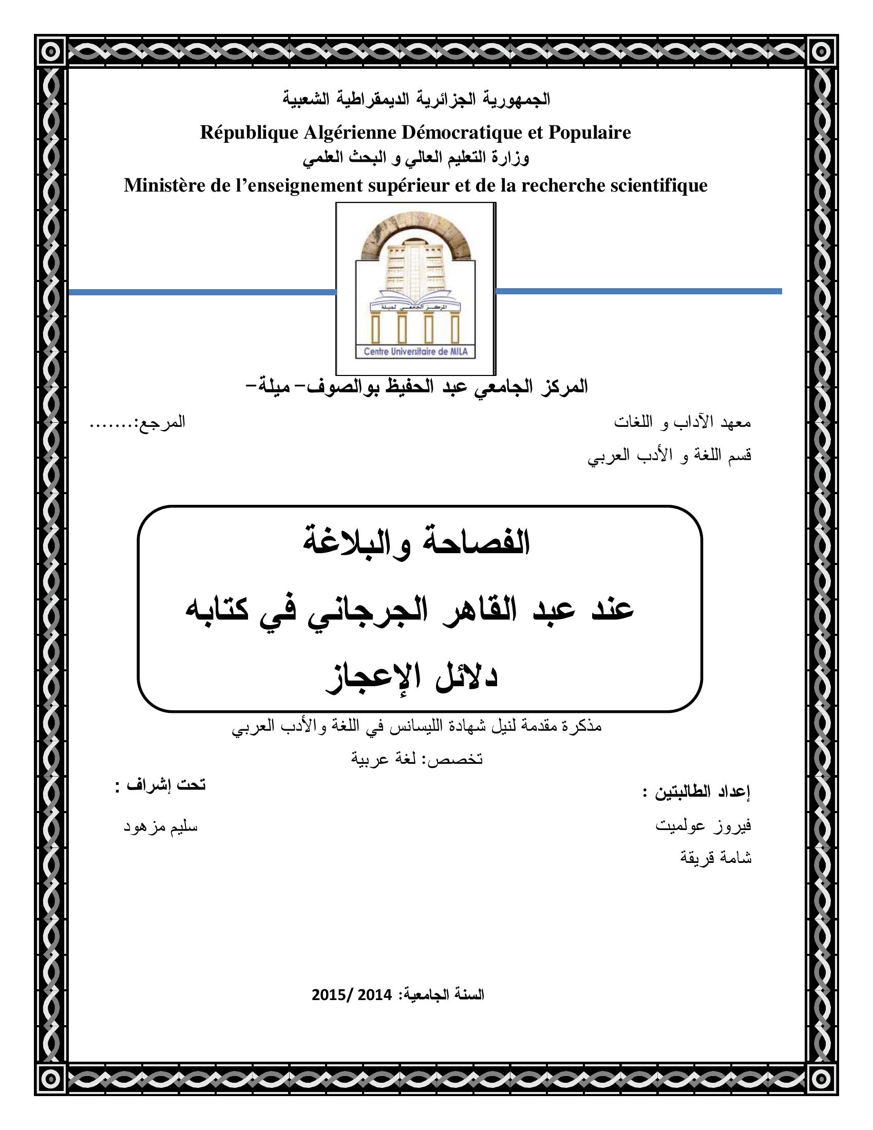 عولميت فيروز et al. (2015). الفصاحة والبلاغة عند عبد القاهر الجرجاني في كتابه دلائل الإعجاز.