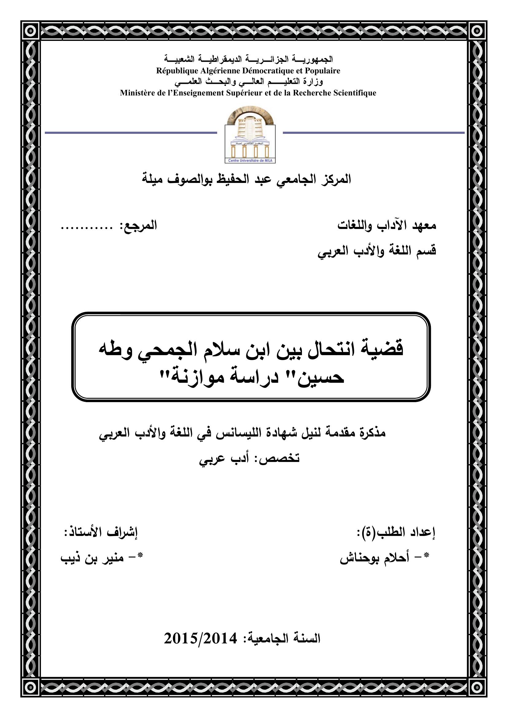 بوحناش أحلام & بن ذيب منير (مشرفا) (2015). قضية انتحال بين ابن سلام الجمحي وطه حسين دراسة موازنة.