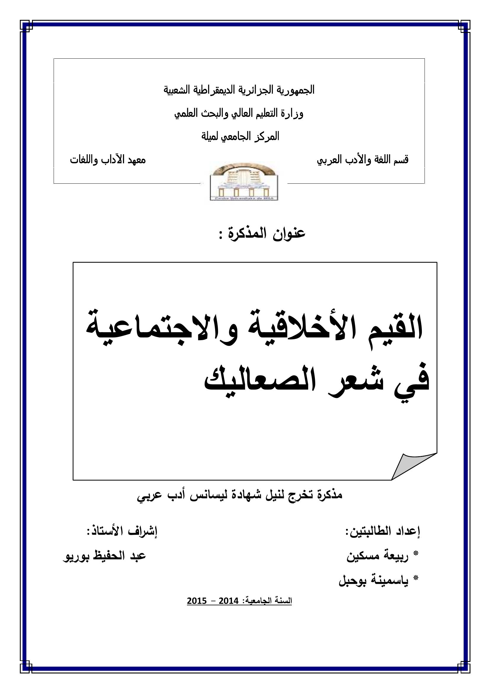 مسكين ربيعة et al. (2015). القيم الأخلاقية والإجتماعية في شعر الصعاليك تأبط شرا أنموذجا.