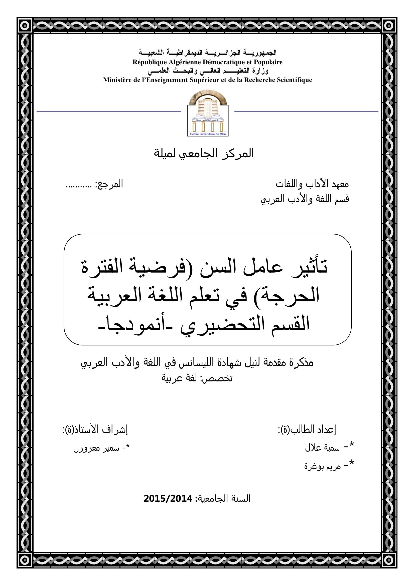 علال سمية et al. (2015). تأثير عامل السن ( فرضية الفترة الحرجة ) في تعلم اللغة العربية القسم التحضيري أنموذجا.