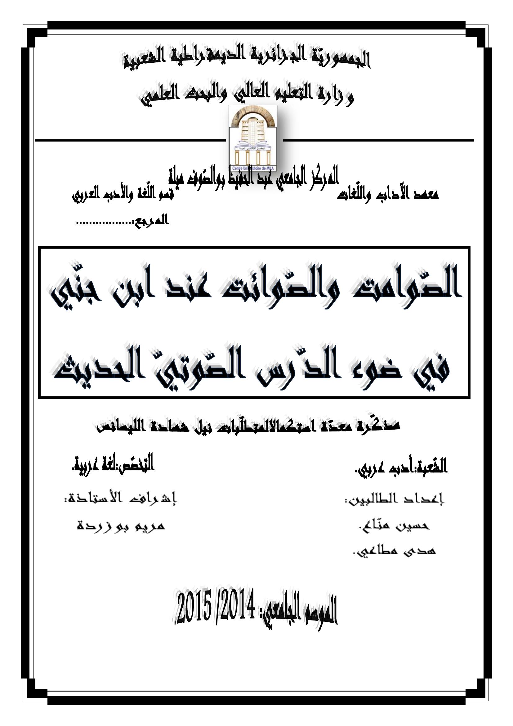 مناع الحسين et al. (2015). الصوامت و الصوائت عند ابن جني في ضوء الدرس الصوتي الحديث.