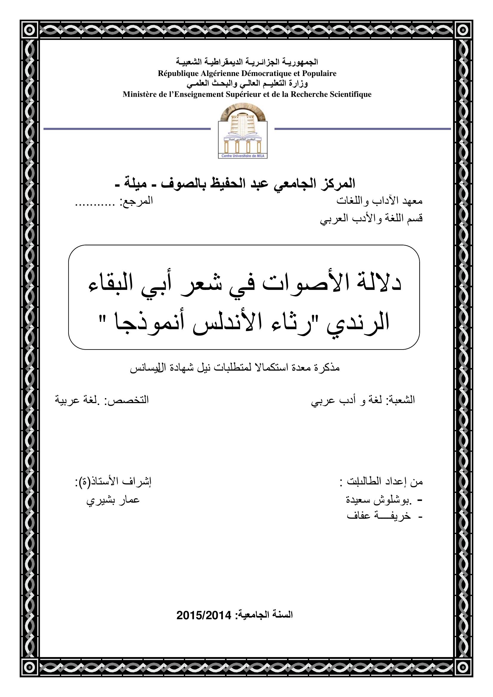 بوشلوش سعيدة et al. (2015). دلالة الأصوات في شعر أبي البقاء الرندي رثاء الأندلس أنموذجا.