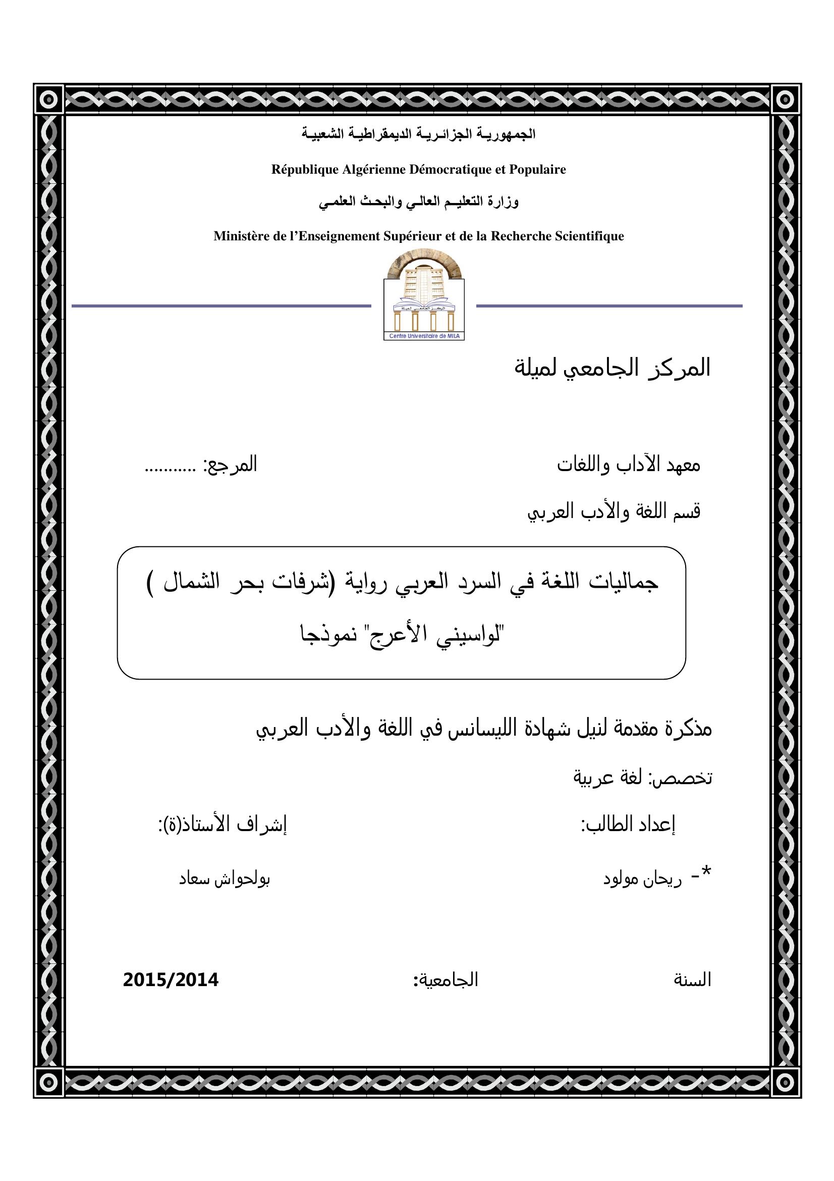 ريحان مولود & بولحواش سعاد (مشرفا ) (2015). جماليات اللغة في السرد العربي رواية شرفات بحر الشمال لواسيني الأعرج.