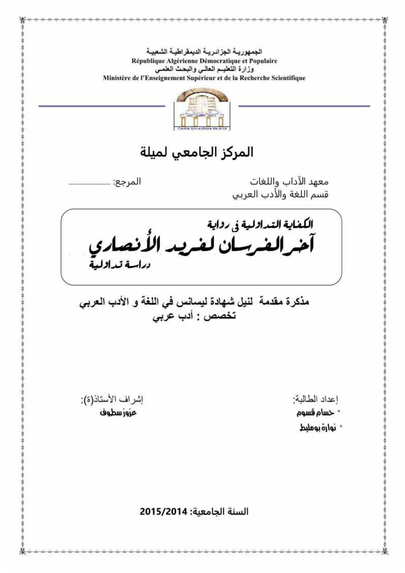 قسوم حياة et al. (2015). الكفاية التداولية في رواية آخر الفرسان لفريد الأنصاري دراسة تداولية.