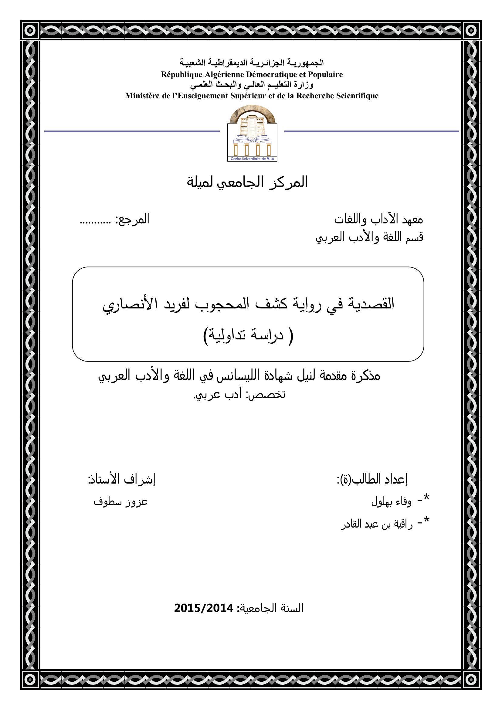 بهلول وفاء et al. (2015). القصدية في رواية كشف المحجوب لفريد الأنصاري (دراسة تداولية ).