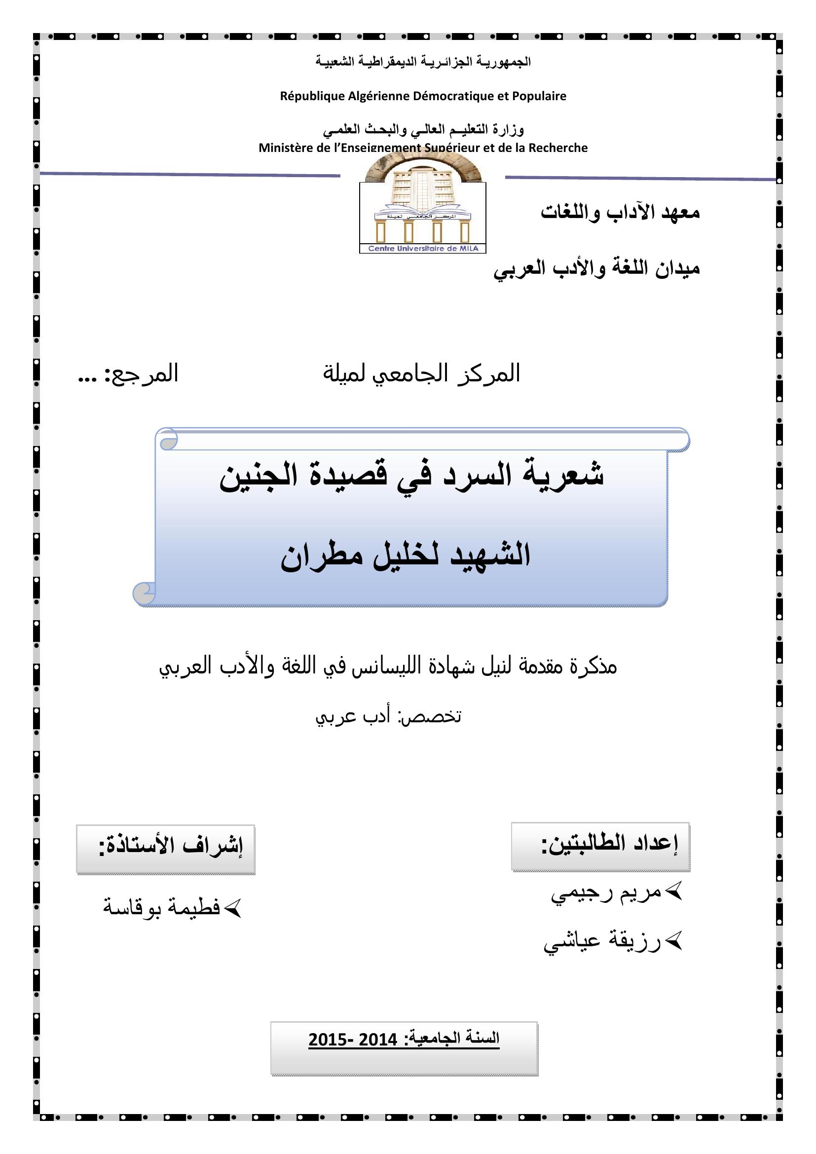 رجيمي مريم et al. (2015). شعرية السرد في قصيدة الجنين الشهيد لخليل مطران.