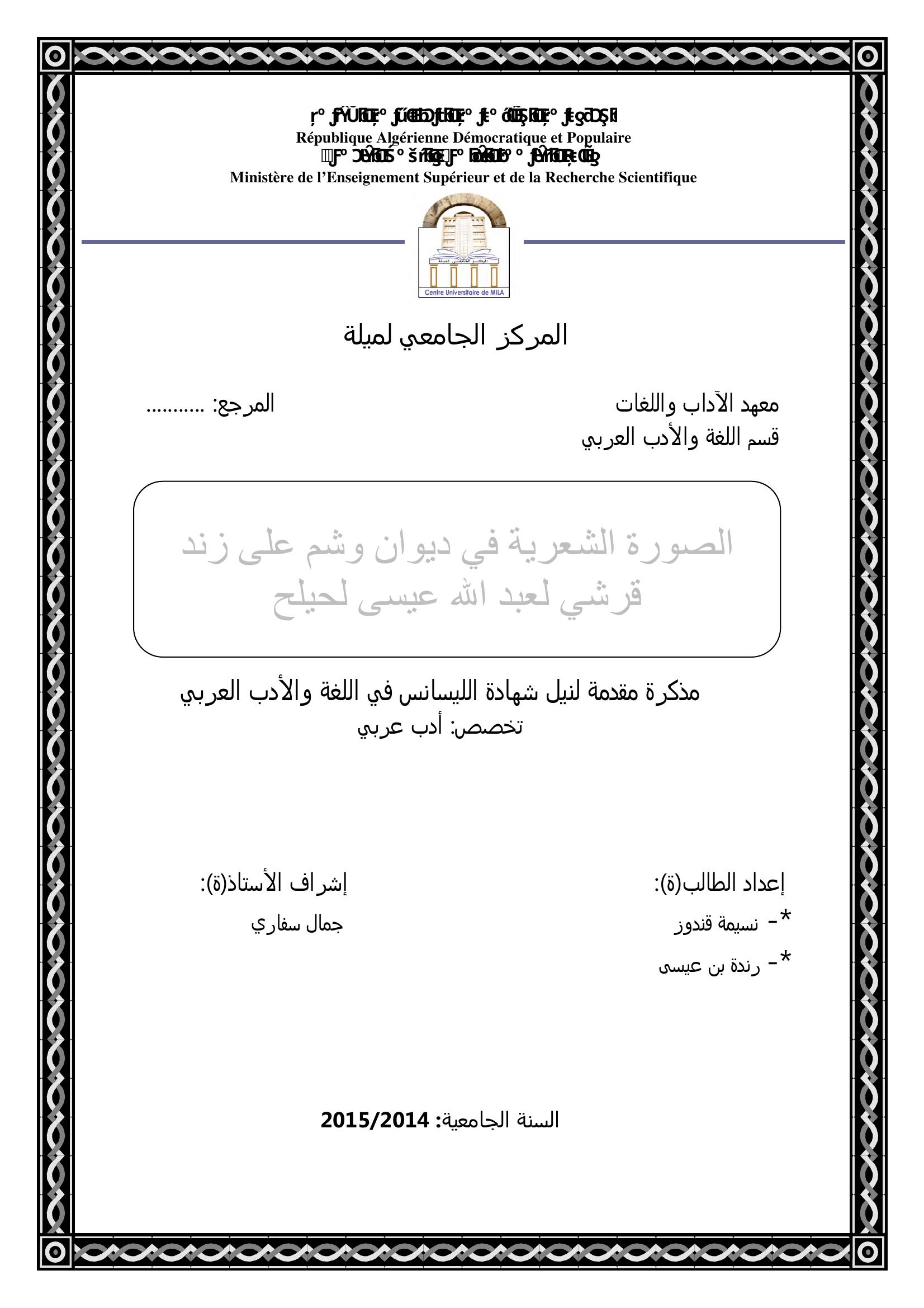 قندوز نسيمة et al. (2015). الصورة الشعرية في ديوان وشم على زند قرشي لعبد الله عيسى لحيلح.