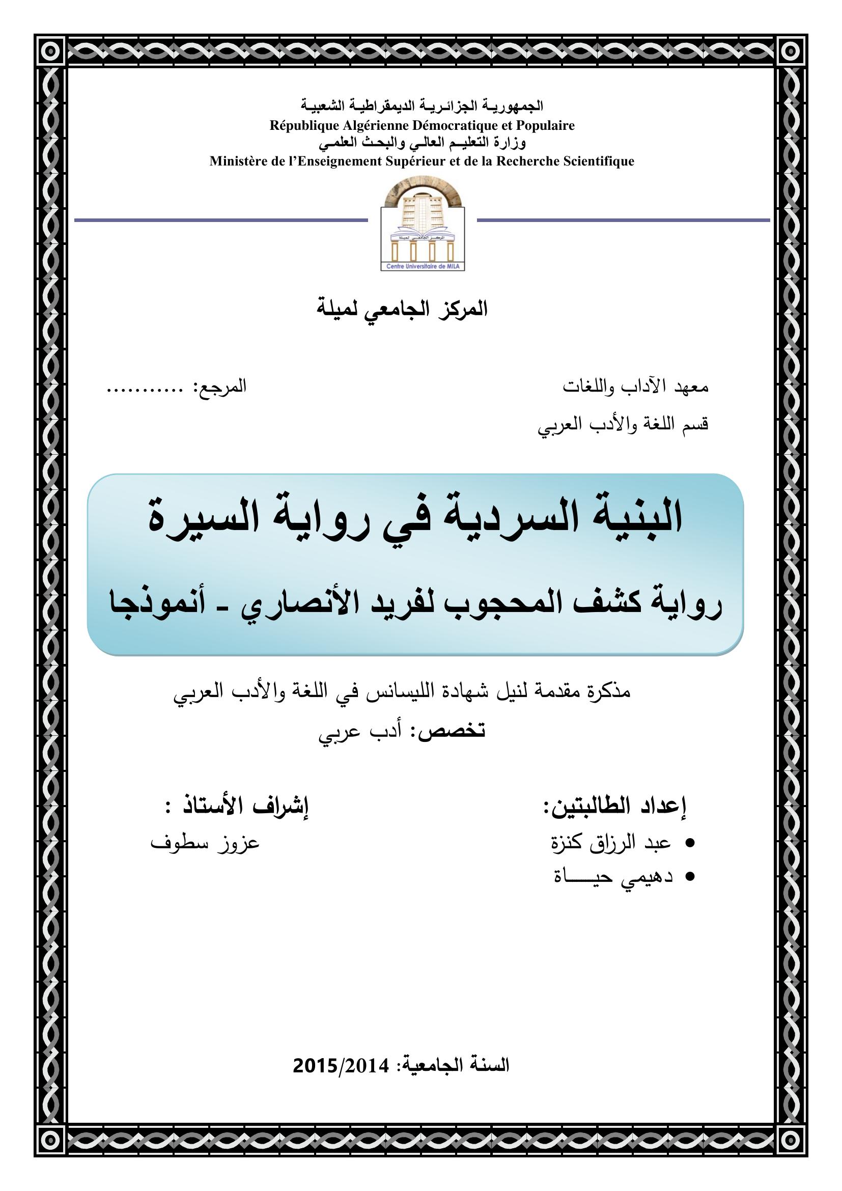 عبد الرزاق كنزة et al. (2015). البنية السردية في رواية السيرة رواية كشف المحجوب لفريد الأنصاري أنموذجا.