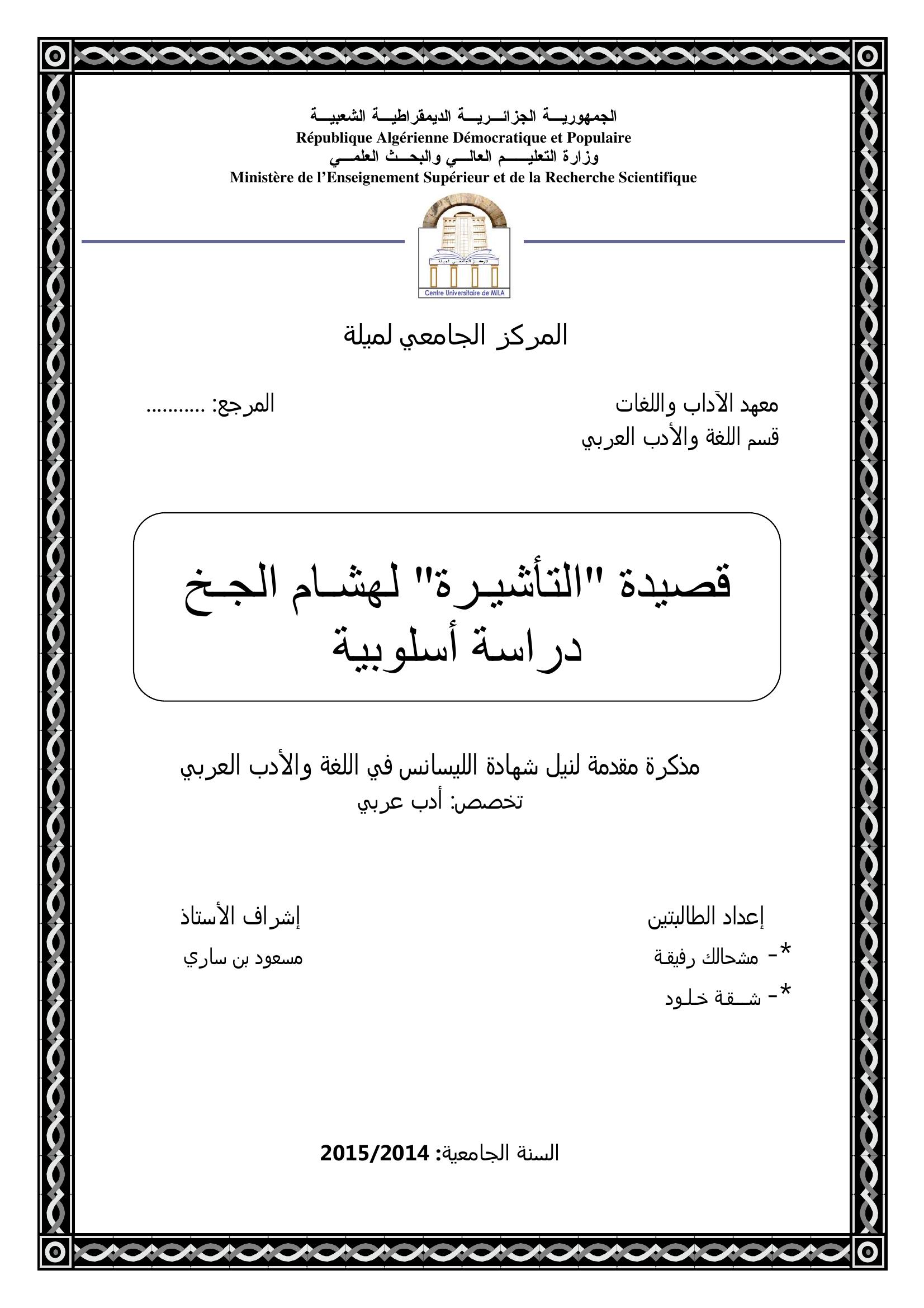 مشحالك رفيقة et al. (2015). قصيدة التأشيرة لهشام الجخ دراسة أسلوبية.
