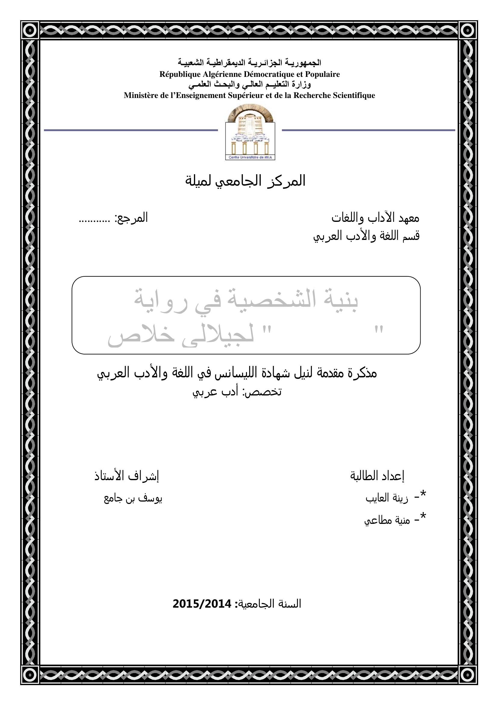 العايب زينة et al. (2015). بنية الشخصية في رواية شدو البلابل لجيلالي خلاص.