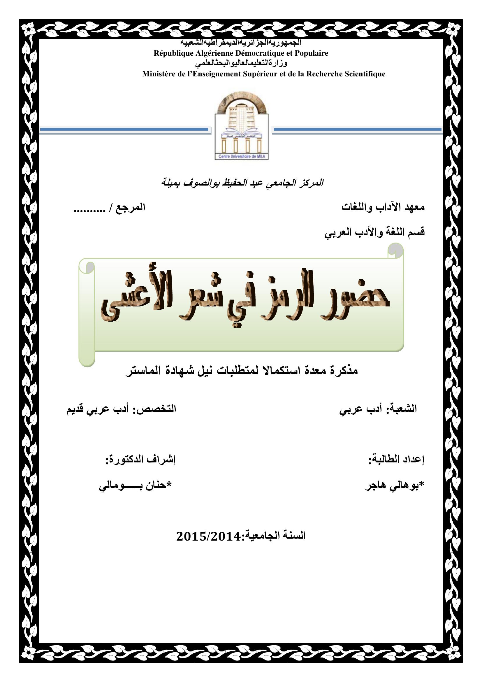 بوهالي هاجر & بومالي حنان (2015). حضور الرمز في شعر الأعشى.