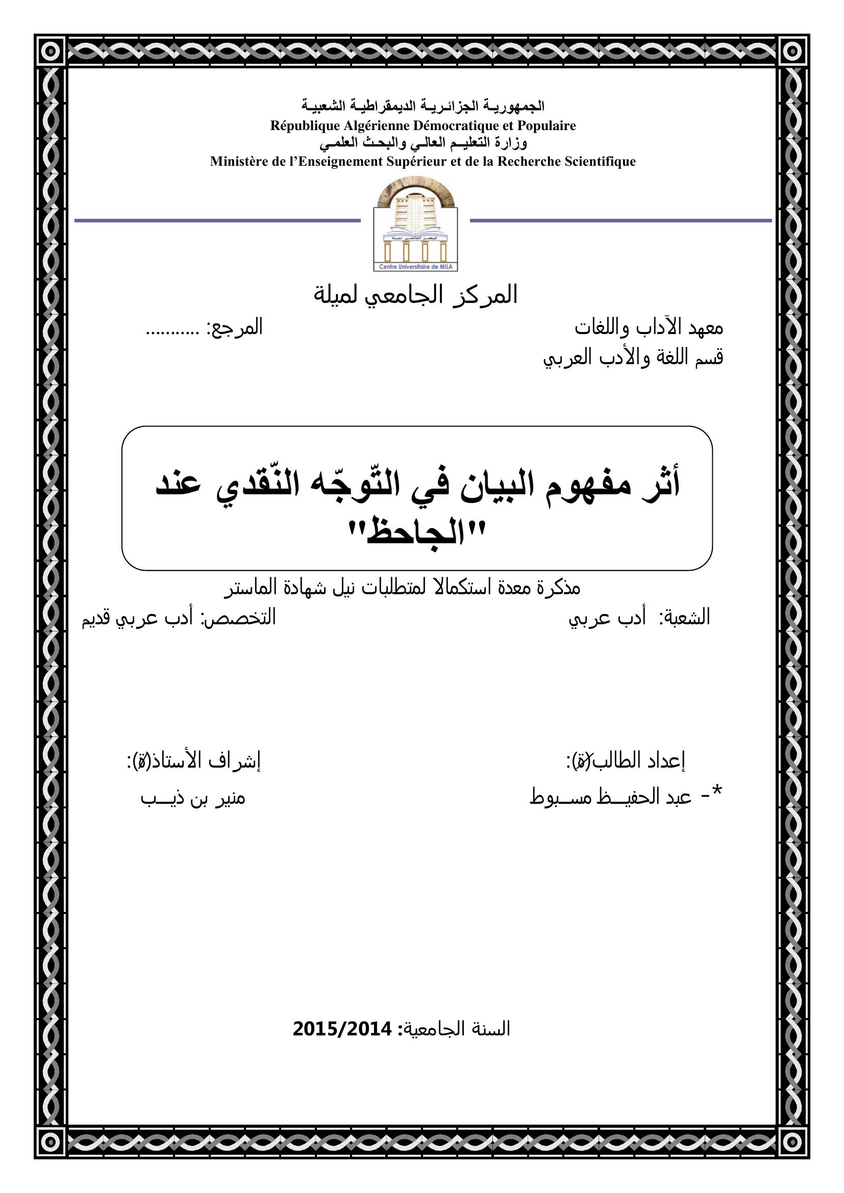 مسبوط عبد الحفيظ & بن ذيب منير (مشرفا) (2015). أثر مفهوم البيان في التوجه النقدي عند الجاحظ.