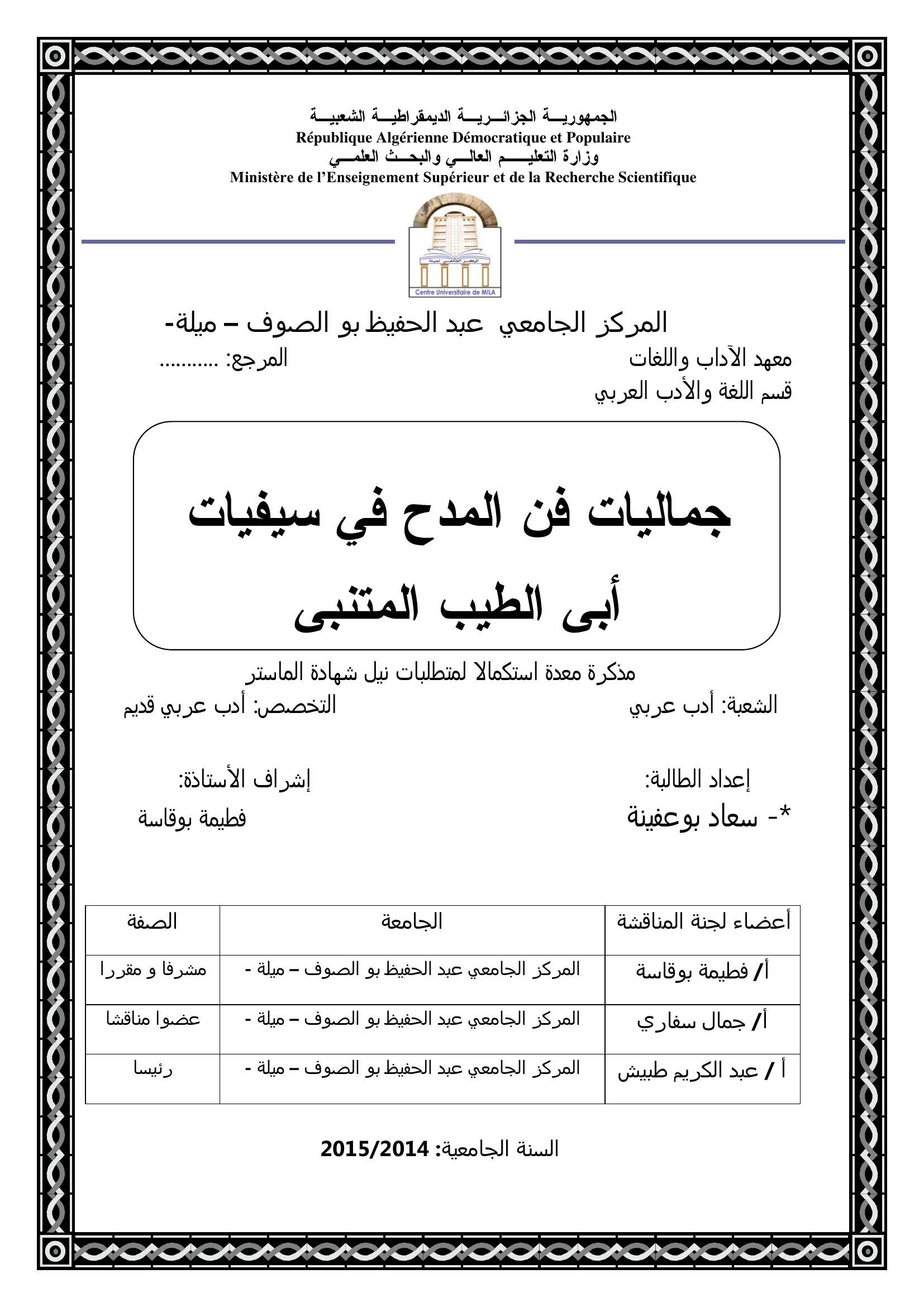 بوعفينة سعاد & بوقاسة فطيمة ( مشرفا) (2015). جماليات فن المدح في سيفيات أبي الطيب المتنبي.