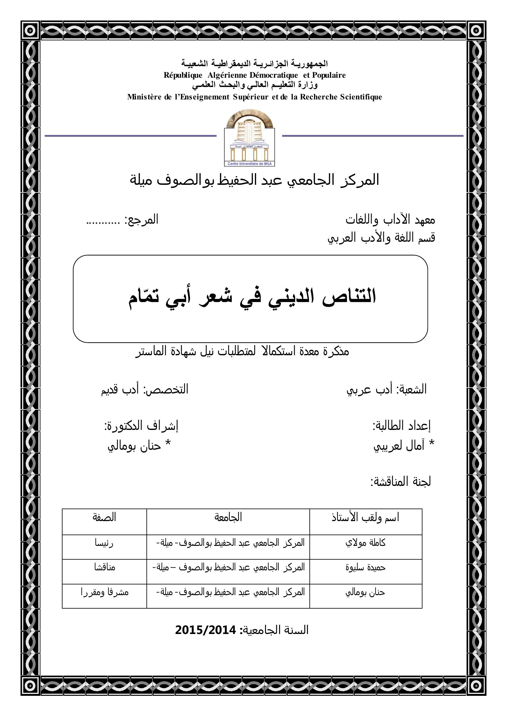 لعريبي أمال & بومالي حنان (2015). التناص الديني في شعر أبي تمام (ماستر- ل م د) .