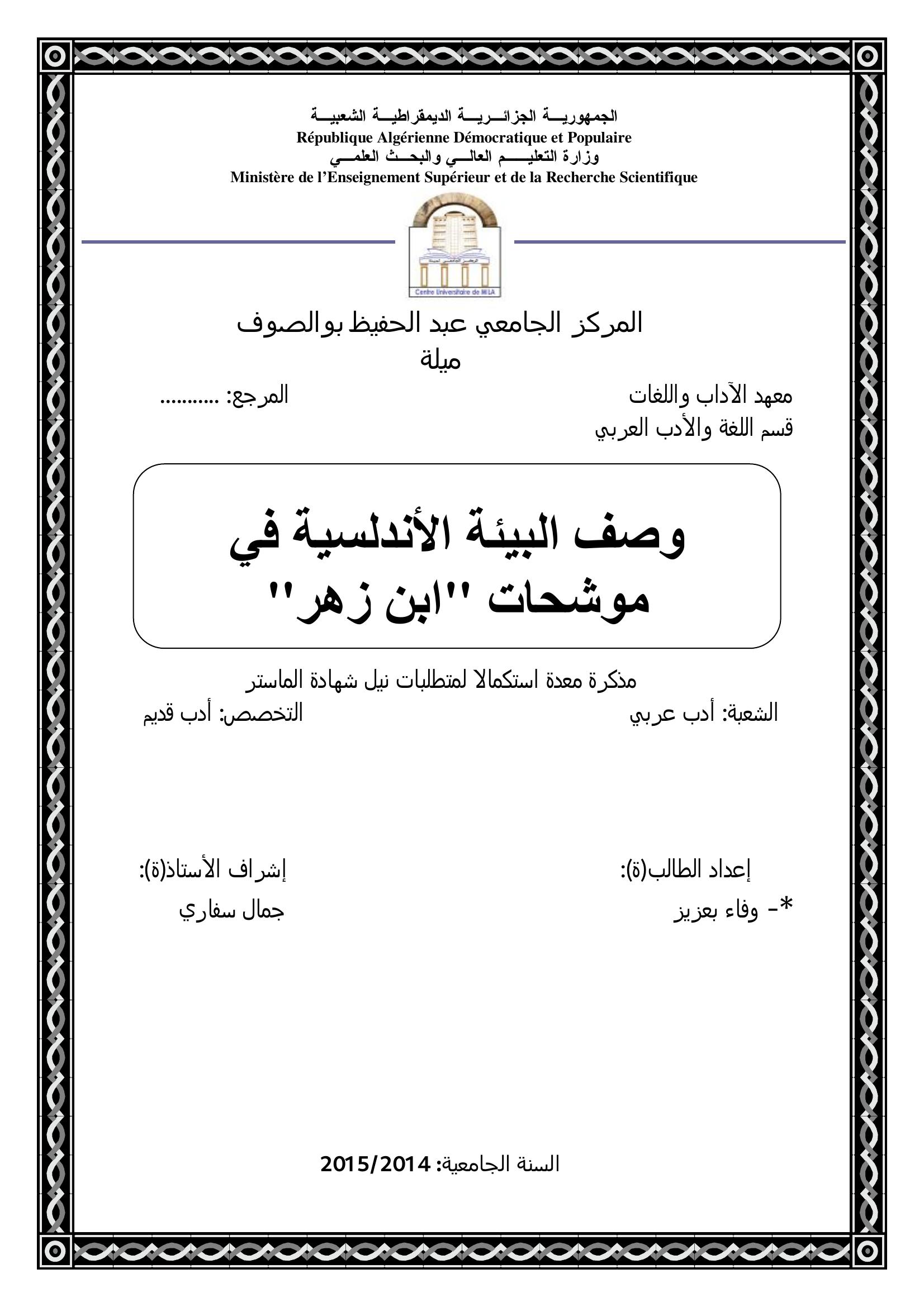 بعزيز وفاء & سفاري جمال (مشرفا) (2015). وصف البيئة الأندلسية في موشحات ابن زهر.