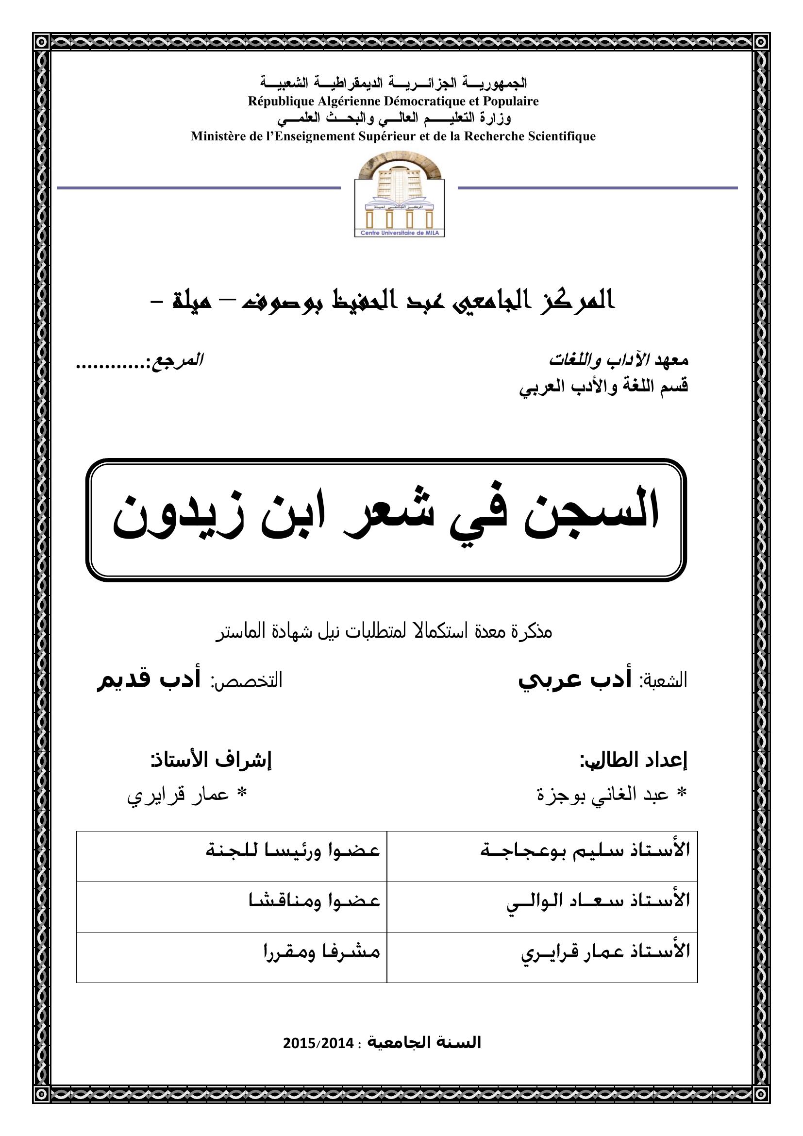 بوجزة عبد الغاني & قرايري عمار (مشرفا) (2015). السجن في شعر ابن زيدون.