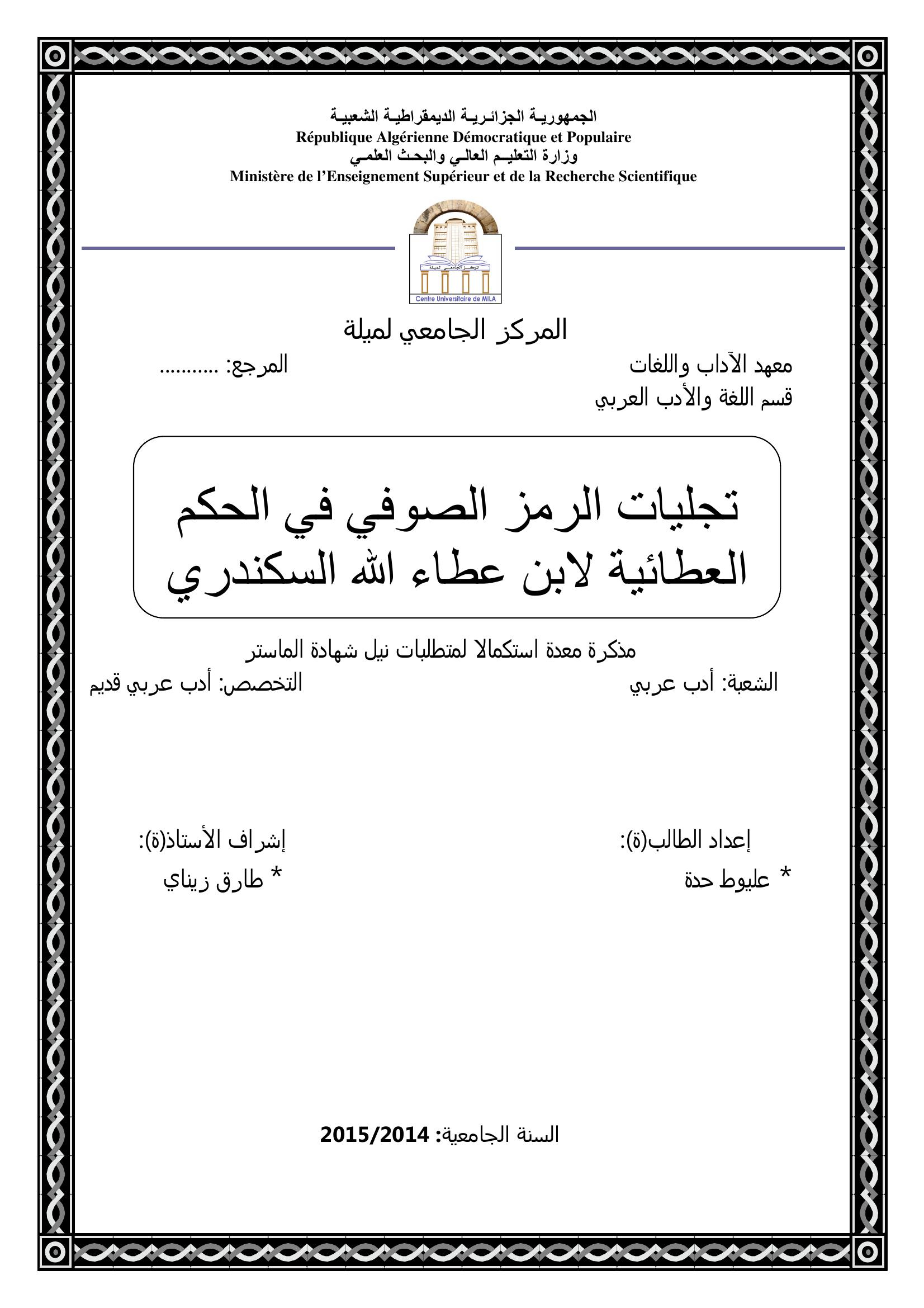عليوط حدة & زيناي طارق(مشرفا) (2015). تجليات الرمز الصوفي قي الحكم العطائية لابن عطاء الله السكندري.