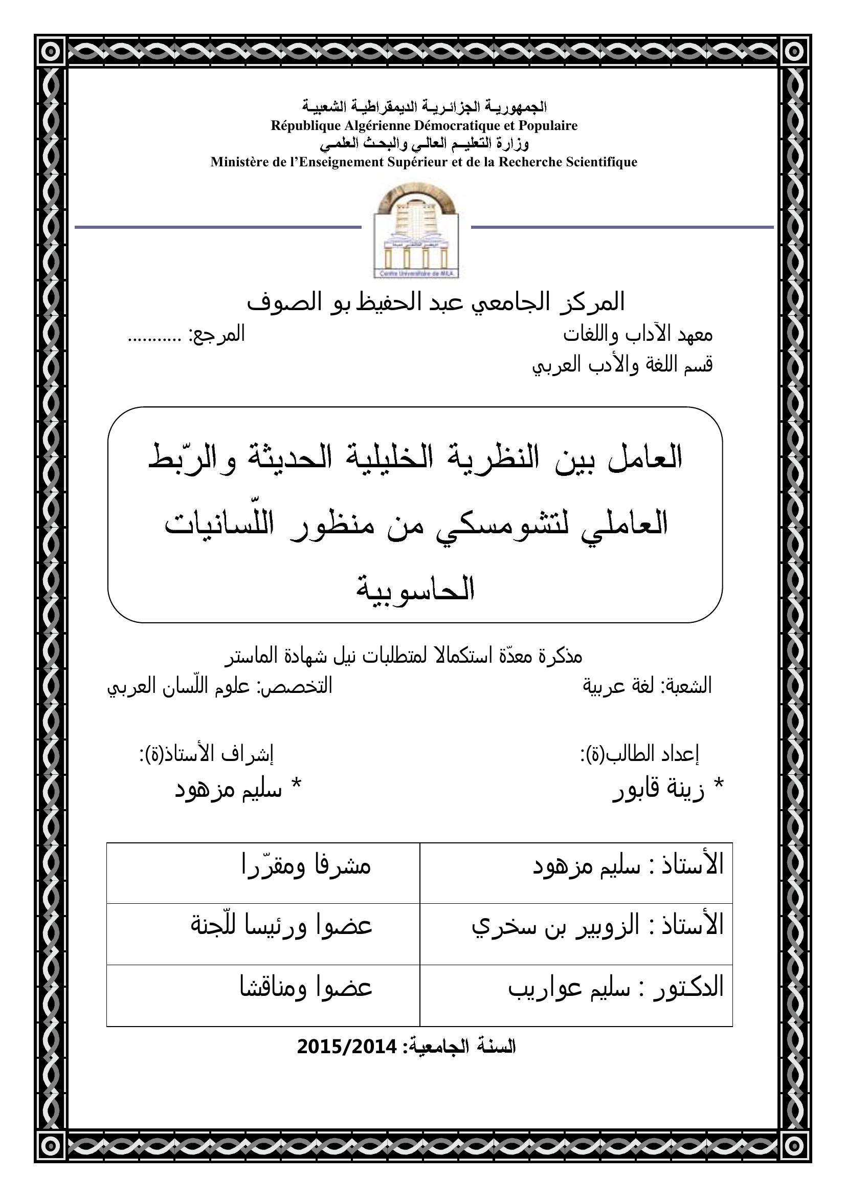 قابور زينة & مزهود سليم (مشرفا) (2015). العامل بين النظرية الخليلية الحديثة والربط العاملي لتشومسكي من منظور اللسانيات الحاسوبية.