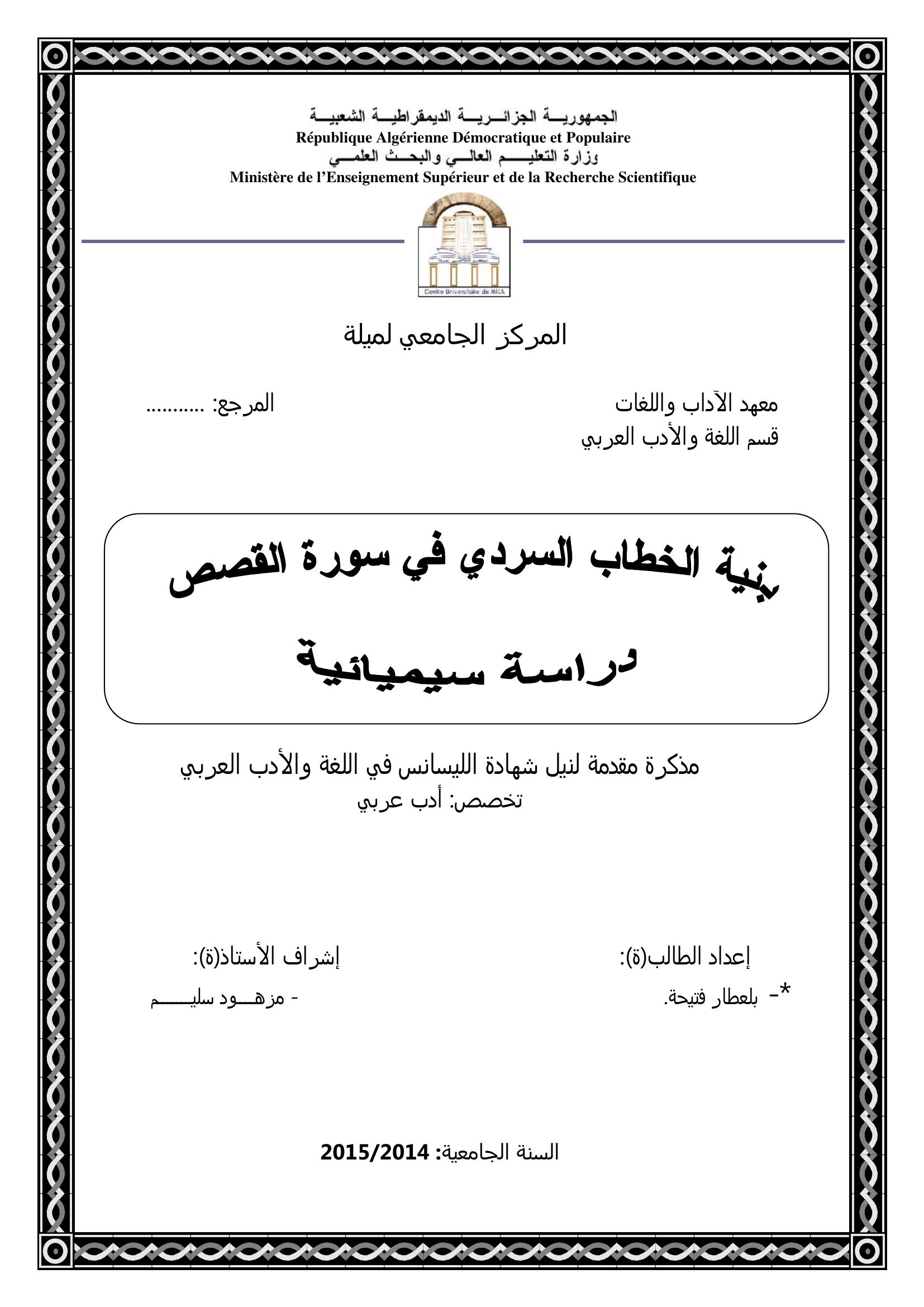 بلعطار فتيحة & مزهود سليم (مشرفا) (2015). بنية الخطاب السردي في سورة القصص دراسة سيميائية.