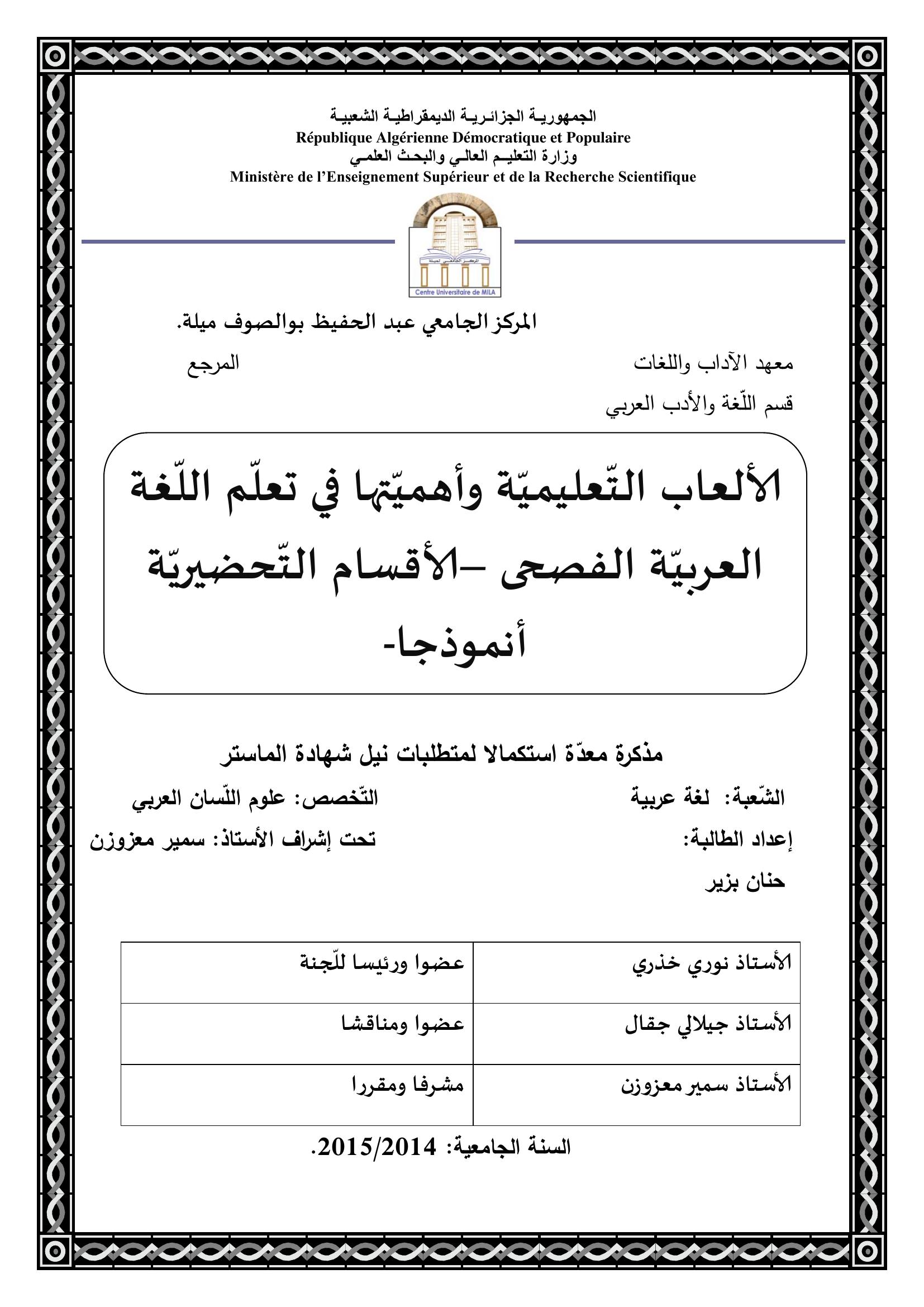 بزير حنان & معزوزن سمير (مشرفا) (2015). الألعاب التعليمية وأهميتها في تعلم اللغة العربية الفصحى الأقسام التحضيرية أنموذجا.
