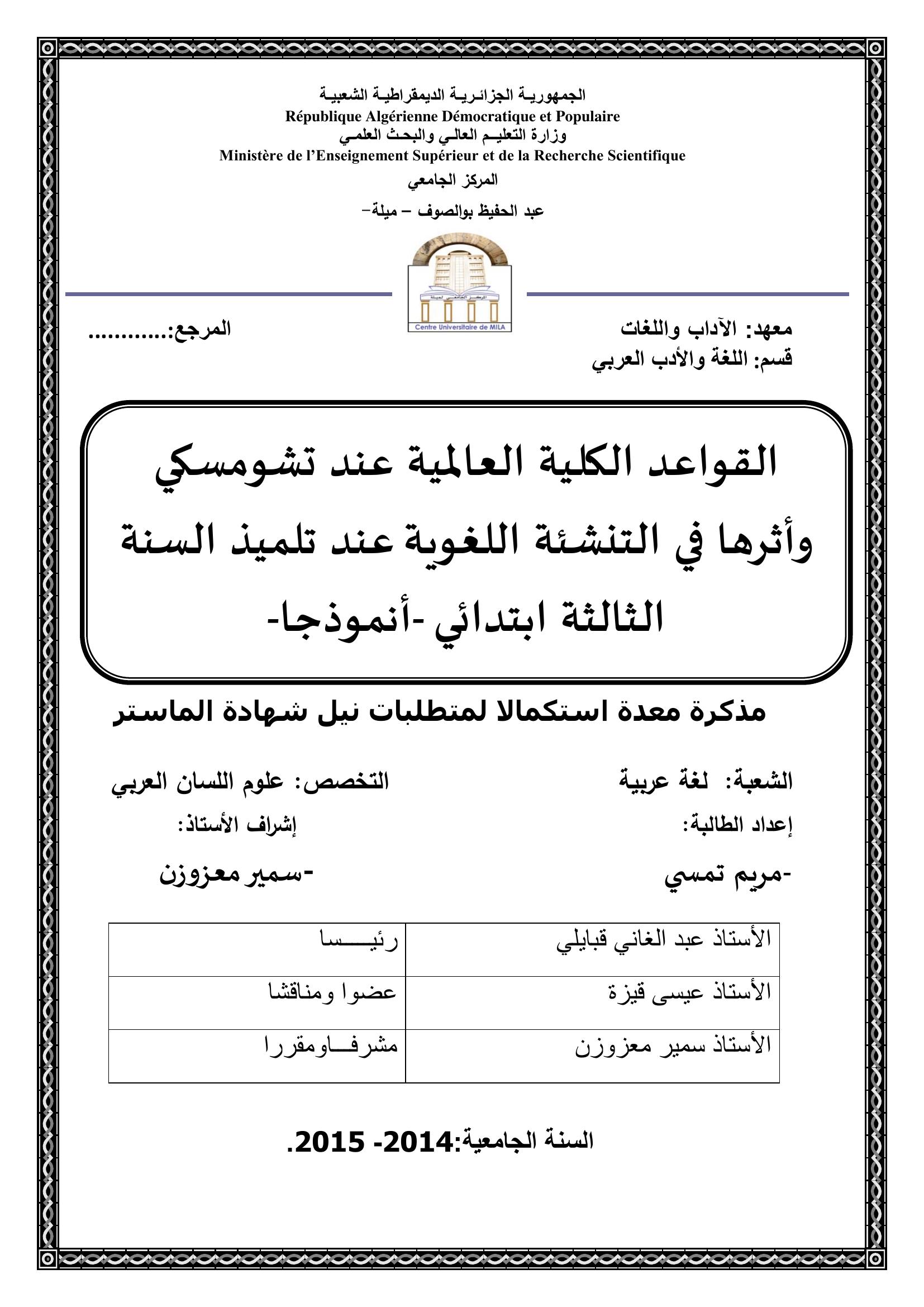 تمسي مريم & معزوزن سمير (مشرفا) (2015). القواعد الكلية العالمية عند تشومسكي وأثرها في التنشئة اللغوية عند تلميذ السنة الثالثة إبتدائي أنموذجا.
