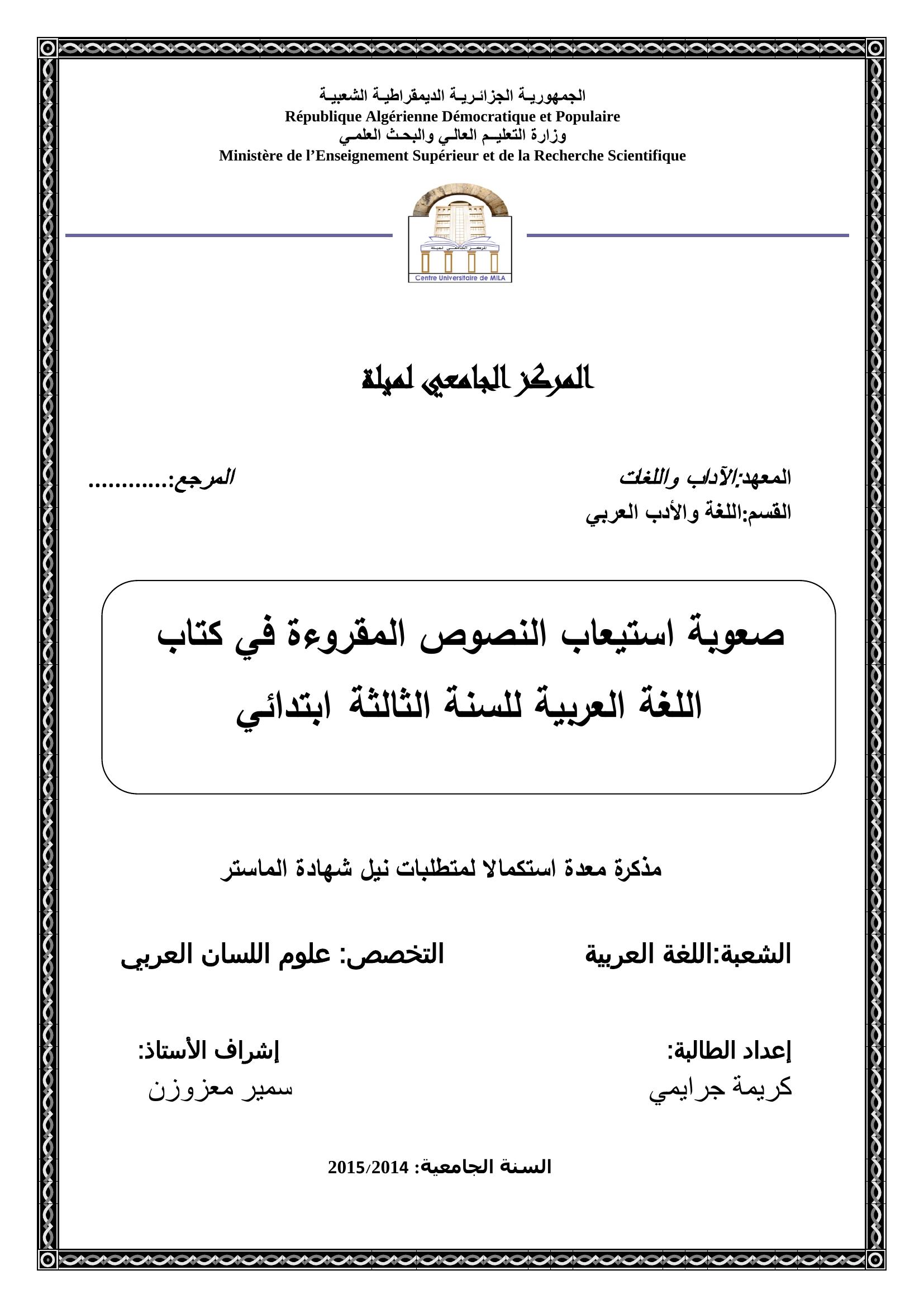 جرايمي كريمة & معزوزن سمير (مشرفا) (2015). صعوبة إستيعاب النصوص المقروءة في كتاب اللغة العربية للسنة الثالثة إبتدائي.