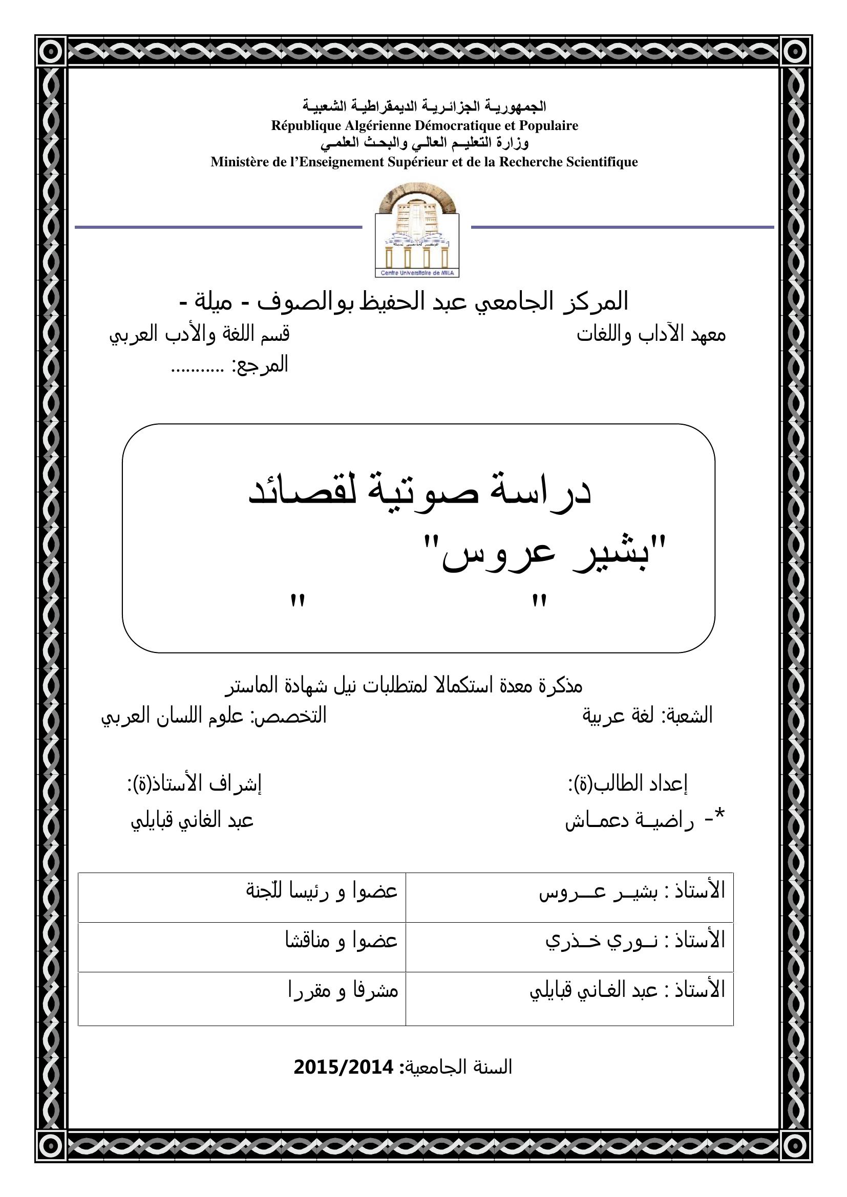 دعماش راضية & قبايلي عبد الغاني (مشرفا) (2015). دراسة صوتية لقصائد بشير عروس ضمن مجموعة الحواس الست.