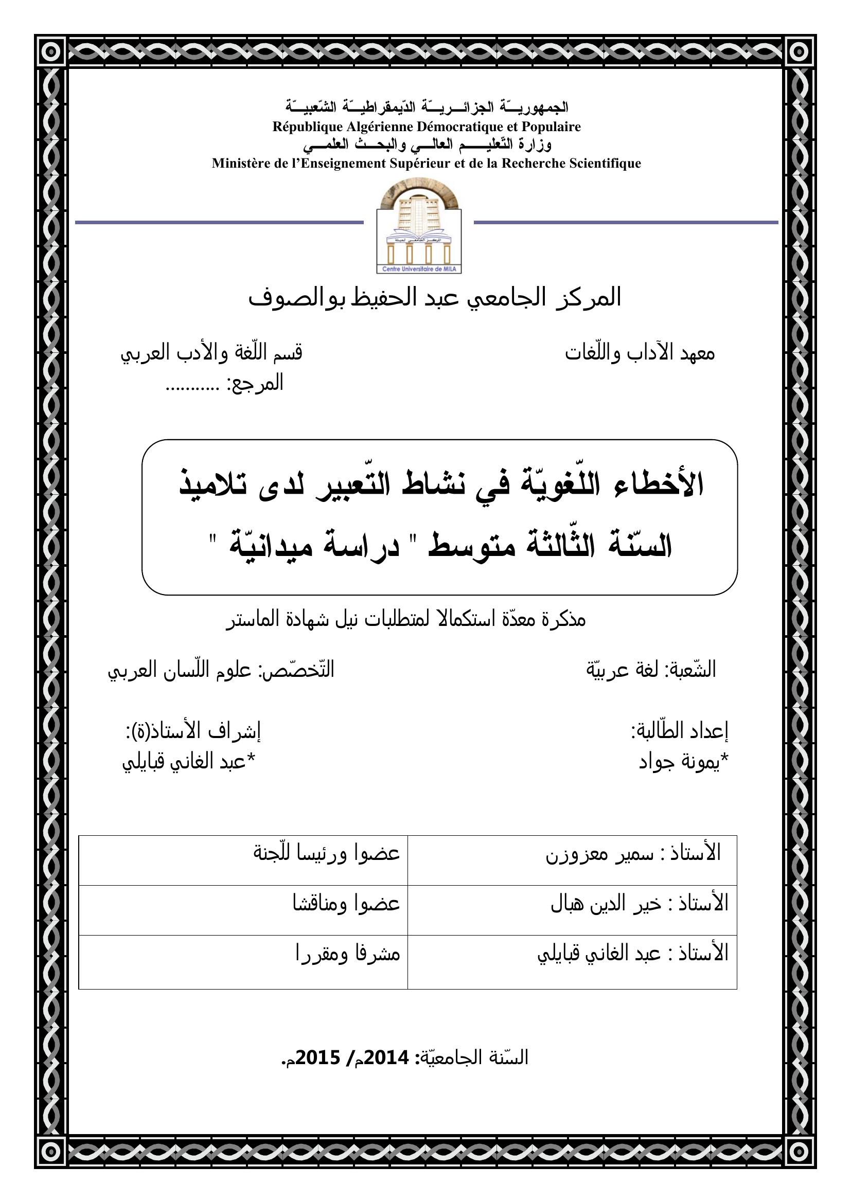 جواد يمونة & قبايلي عبد الغاني (مشرفا) (2015). الأخطاء اللغوية في نشاط التعبير لدى تلاميذ السنة الثالثة متوسط دراسة ميدانية.