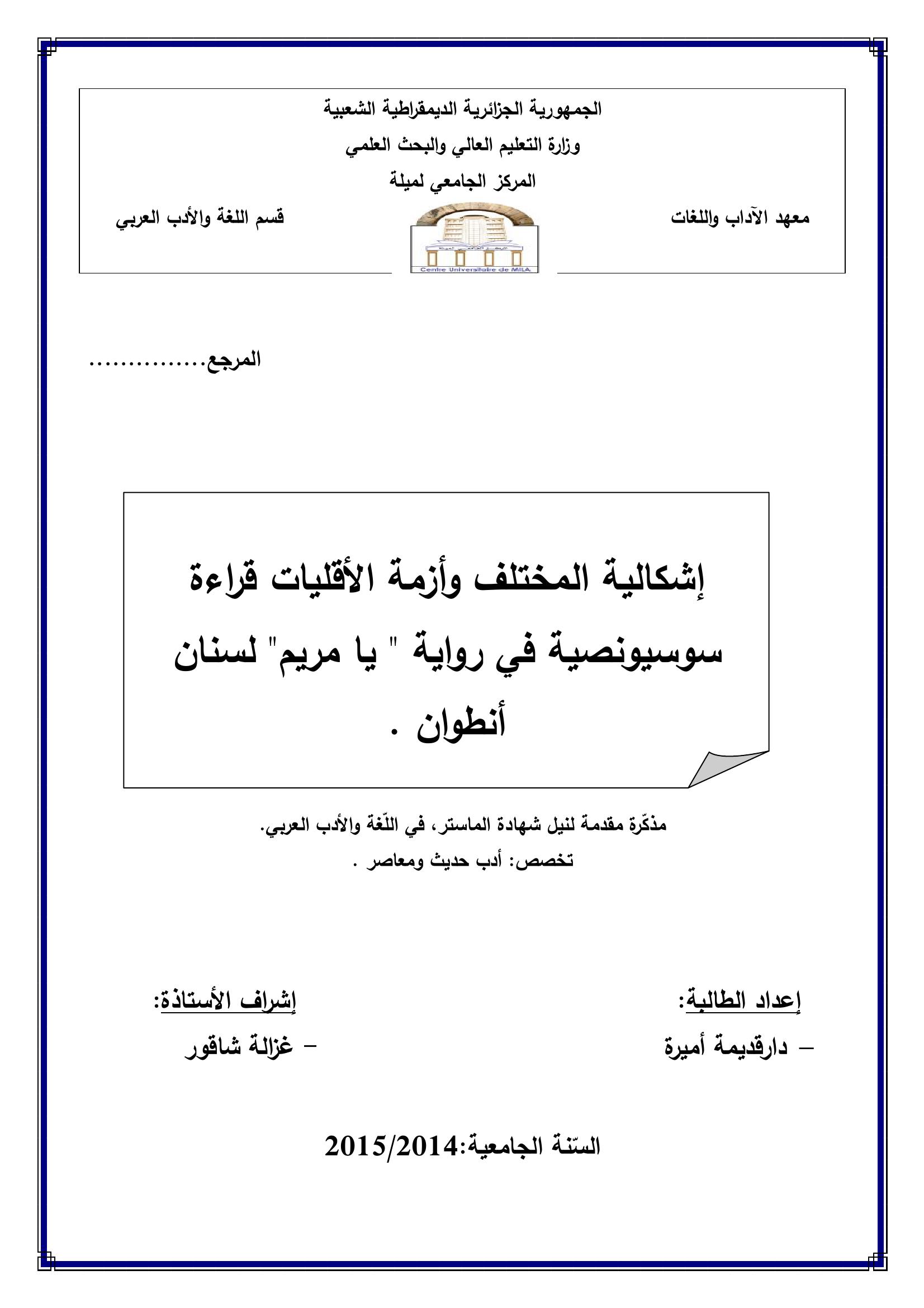 دار قديمة أميرة & شاقور غزالة ( مشرفا) (2015). إشكالية المختلف و أزمة الأقليات قراءة سوسيو نصية في رواية يا مريم لسنان أنطوان.