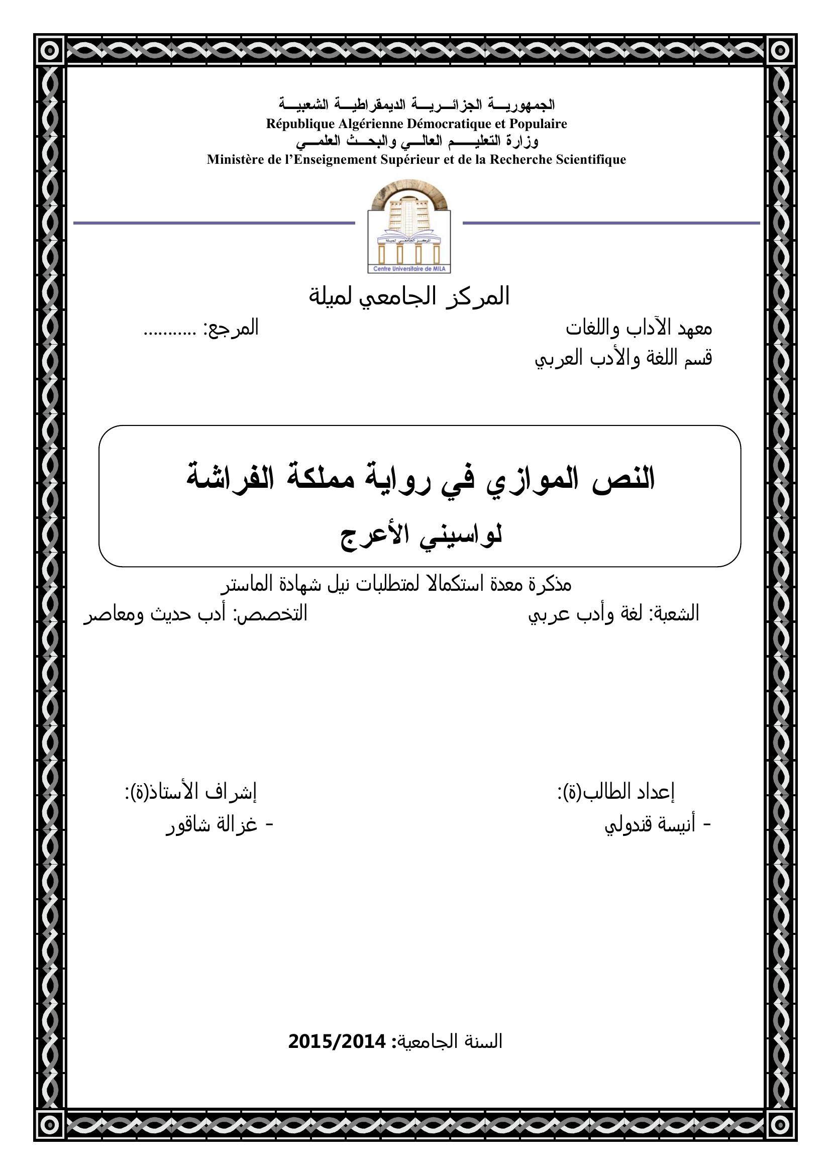 آنسة قندولي & شاقور غزالة ( مشرفا) (2015). النص الموازي في رواية مملكة الفراشة لواسيني الأعرج.