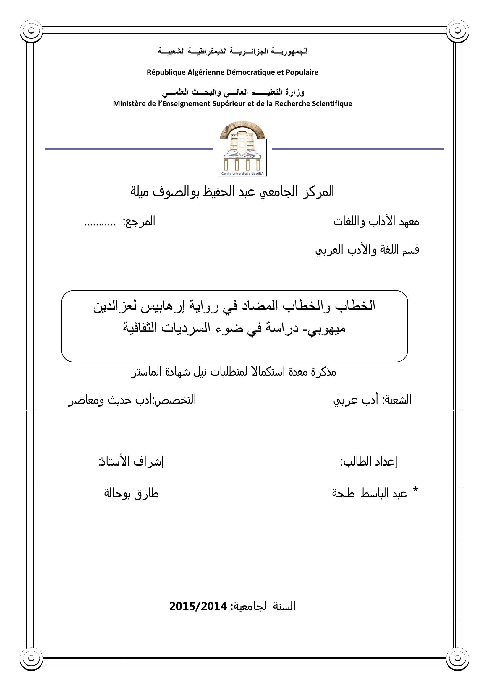 طلحة عبد الباسط & بوحالة طارق (مشرفا) (2015). الخطاب والخطاب المضاد في رواية إرهابيس لعز الدين ميهوبي دراسة في ضوء السرديات الثقافية.