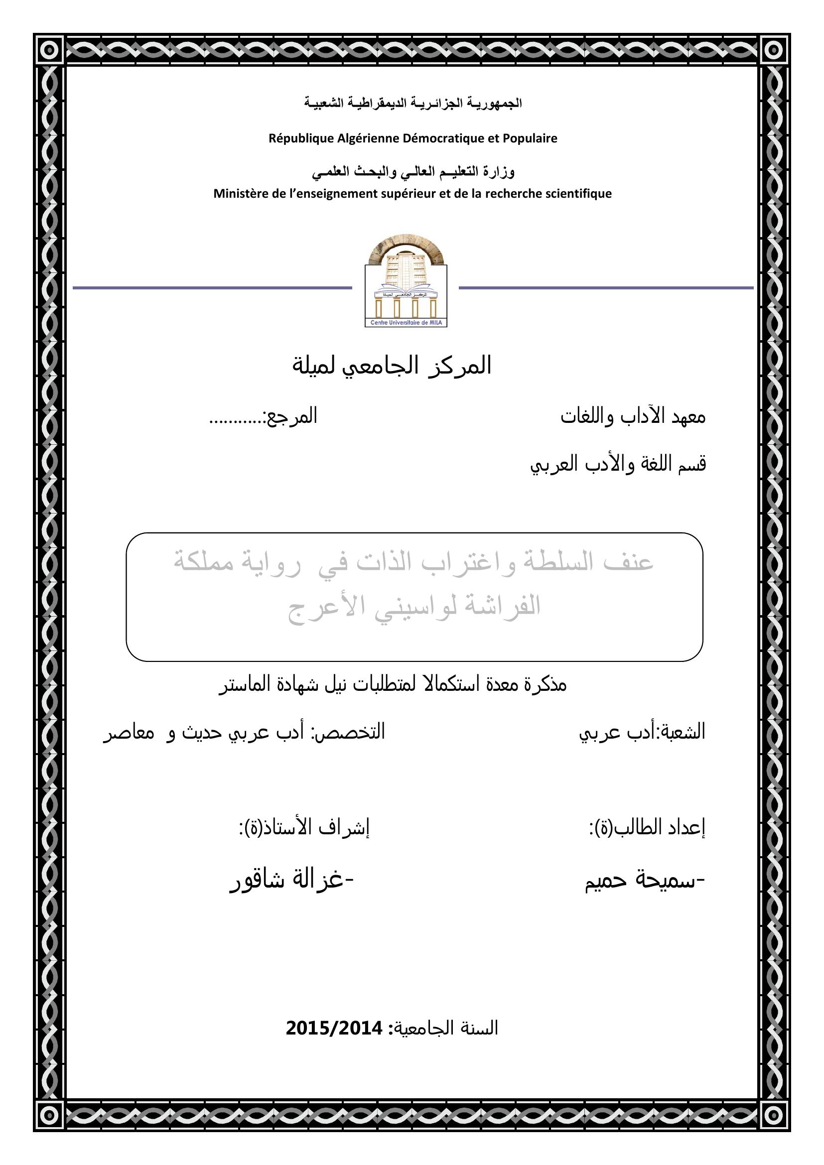 حميم سميحة & شاقور غزالة ( مشرفا) (2015). عنف السلطة واغتراب الذات في رواية مملكة الفراشة لواسيني الأعرج.