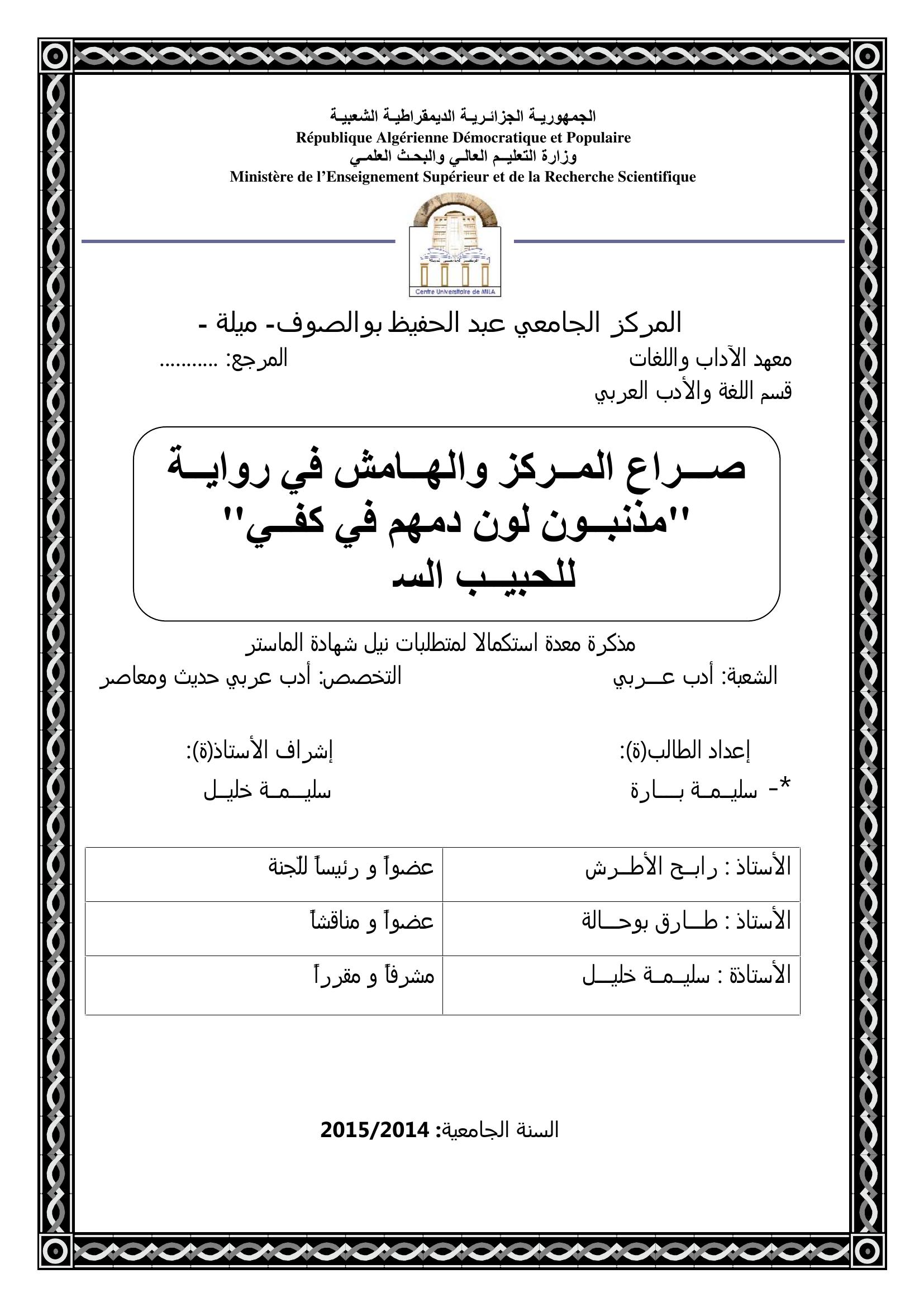 بارة سليمة & خليل سليمة (مشرفا) (2015). صراع المركز والهامش في رواية مذنبون لون دمهم في كفي للحبيب السائح.