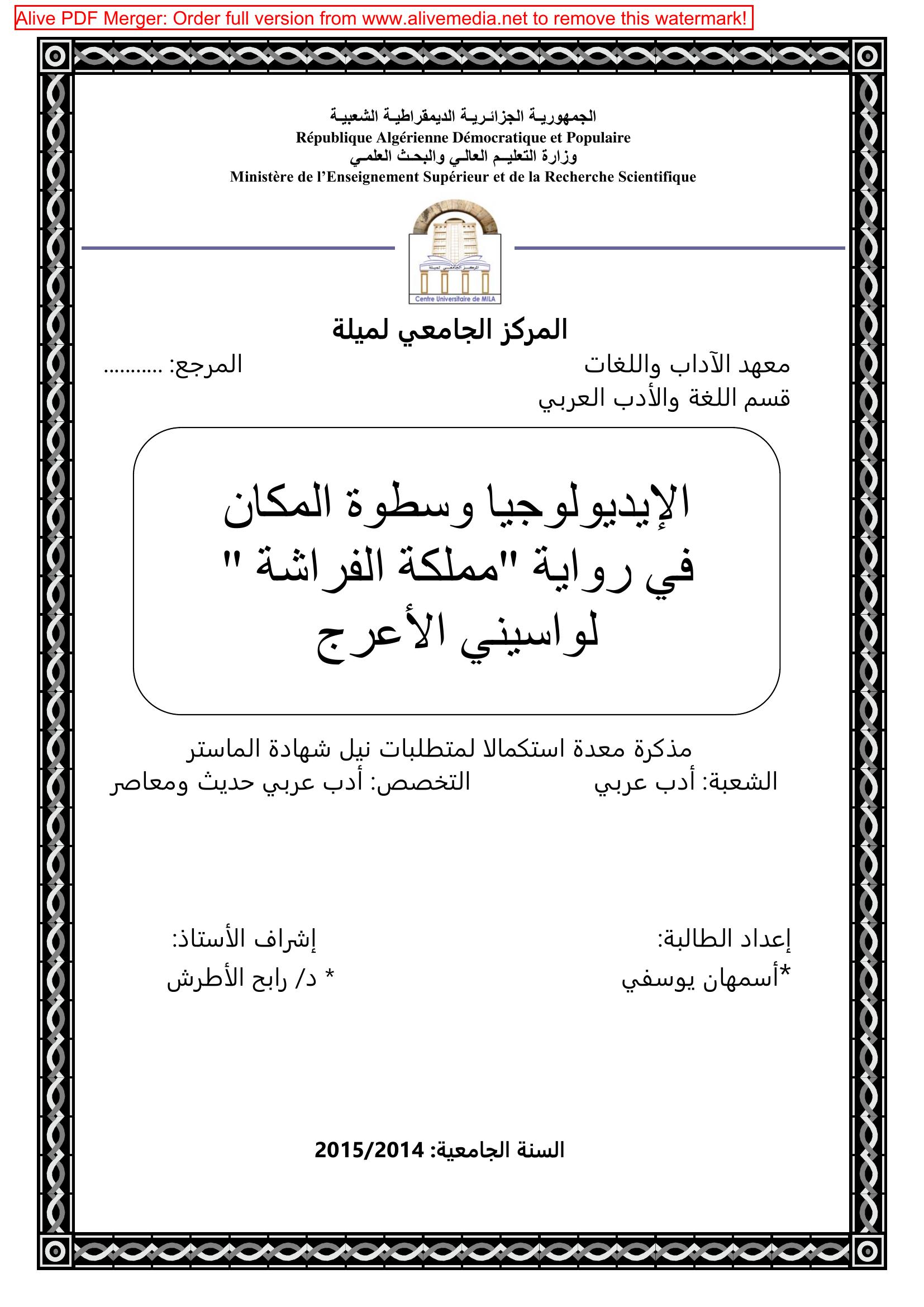يوسفي إسمهان & الأطرش رابح( مشرفا) (2015). الإيديولوجيا وسطوة المكان في رواية مملكة الفراشة لواسيني الأعرج.