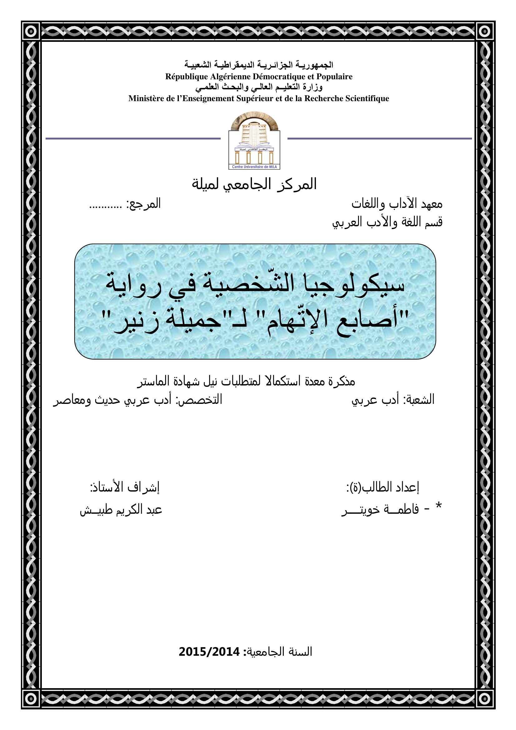 خويتر فاطمة & طبيش عبد الكريم(مشرفا) (2015). سيكولوجيا الشخصية في رواية أصابع الإتهام لجميلة زنير.