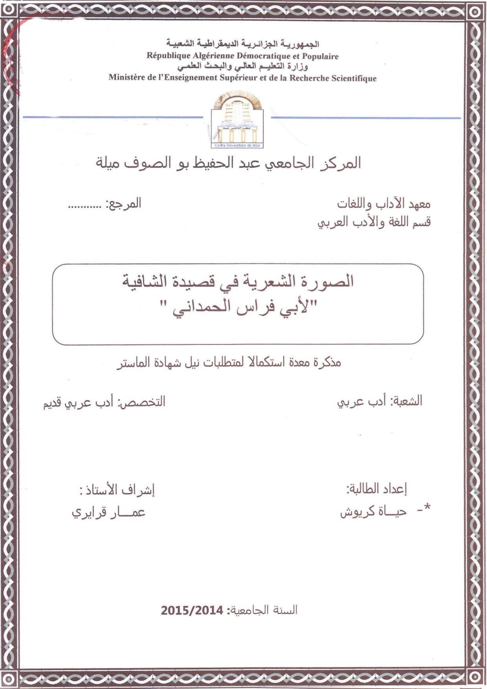 كريوش حياة & قرايري عمار (مشرفا) (2015). الصورة الشعرية في قصيدة الشافية لأبي فراس الحمداني.