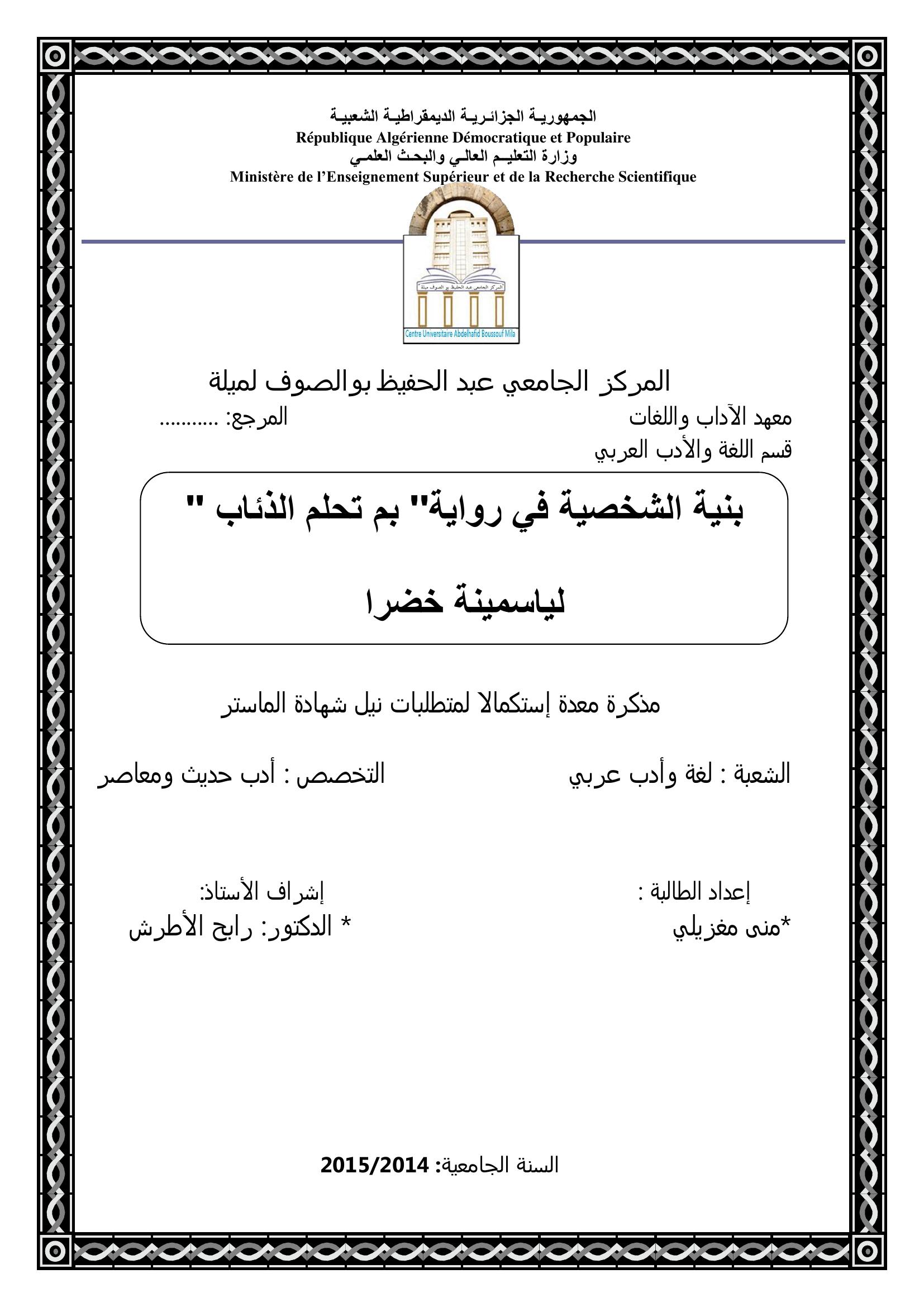 مغزيلي منى & الأطرش رابح( مشرفا) (2015). بنية الشخصية في رواية بم تحلم الذئاب لياسمينة خضرا.