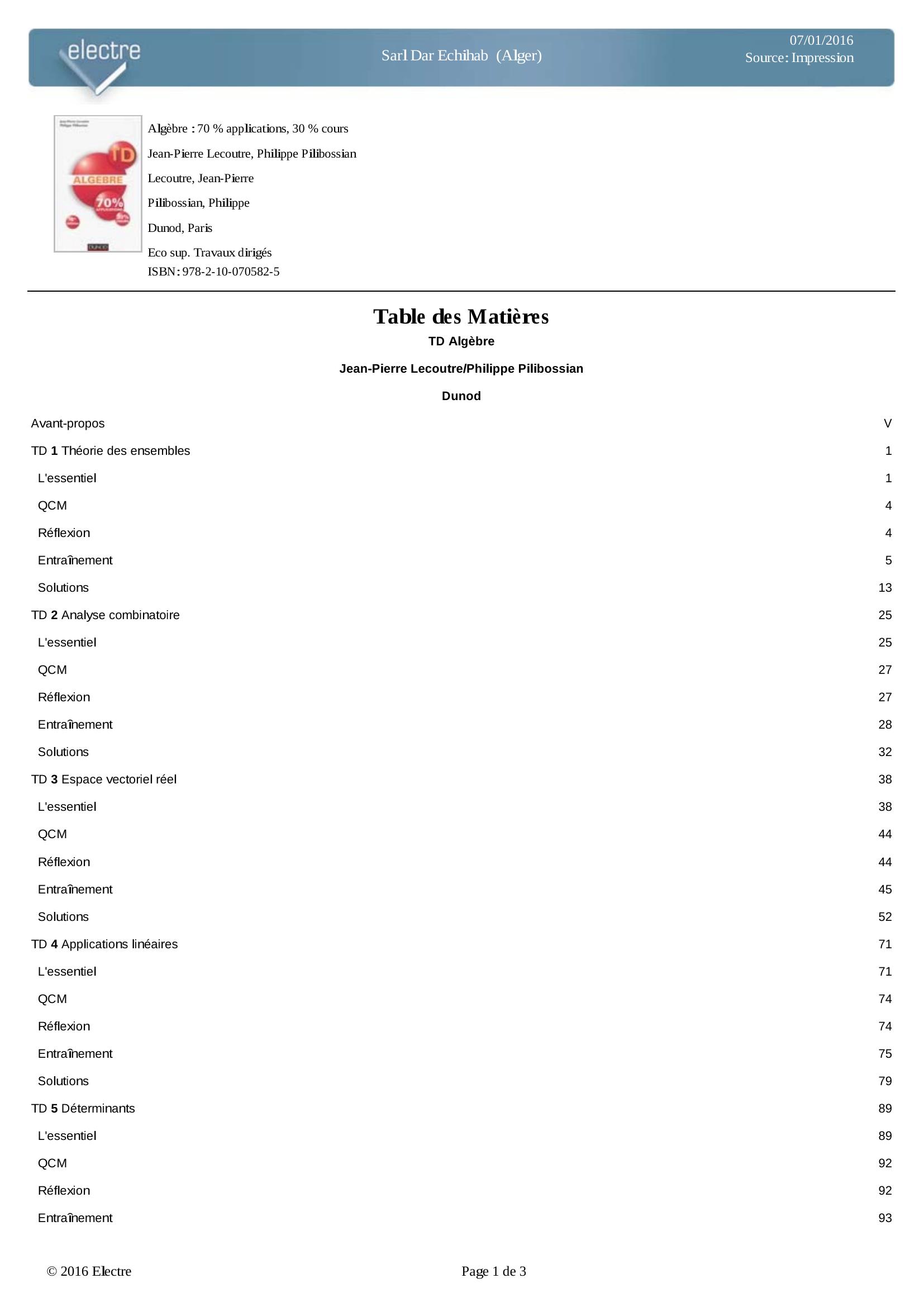 Jean-Pierre Lecoutre (2014). Algèbre : 70 % applications, 30 % cours (4.éd) . Dunod;