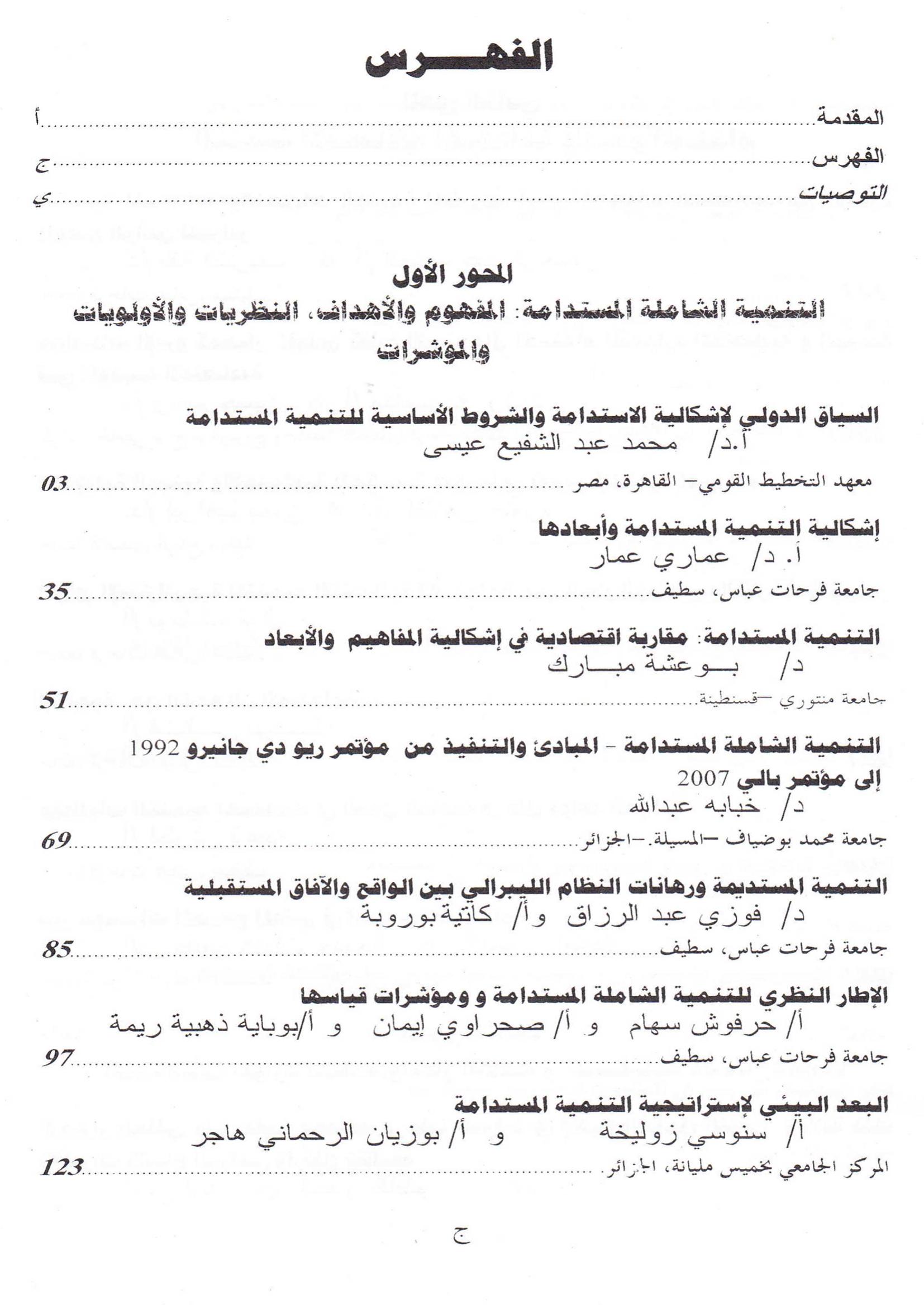 منشورات مخبر الشراكة والاستثمار في المؤسسات الصغيرة والمتوسطة في الفضاء الأورو -ممغاربي (2008). التنمية المستدامة والكفاءة الاستخدامية للموارد المتاحة
