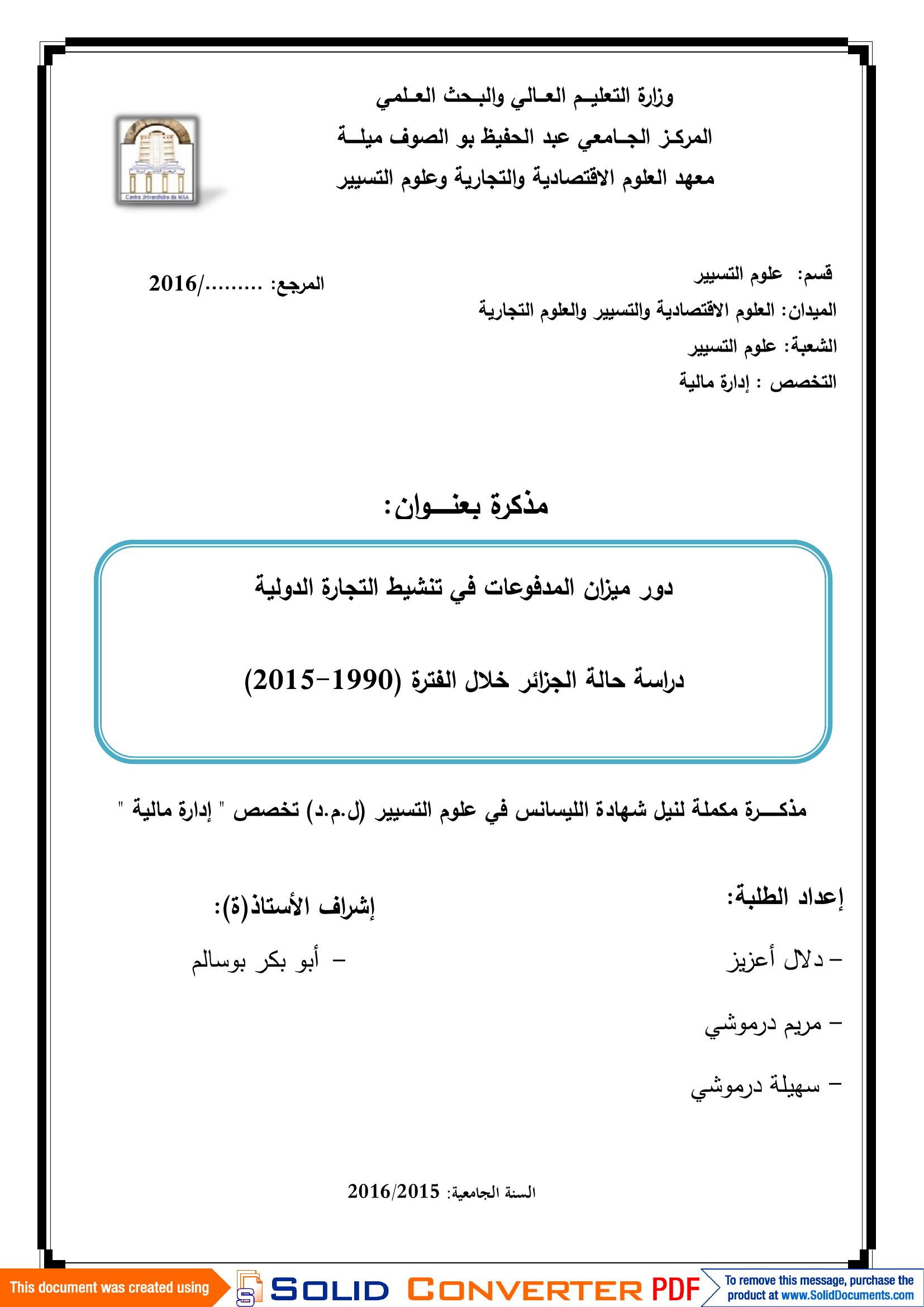 أعزيز دلال & أبوبكر بوسالم(مشرفا) (2016). دور ميزان المدفوعات في تنشيط التجارة الدولية : دراسة حالة الجزائر خلال الفترة (1990-2015).