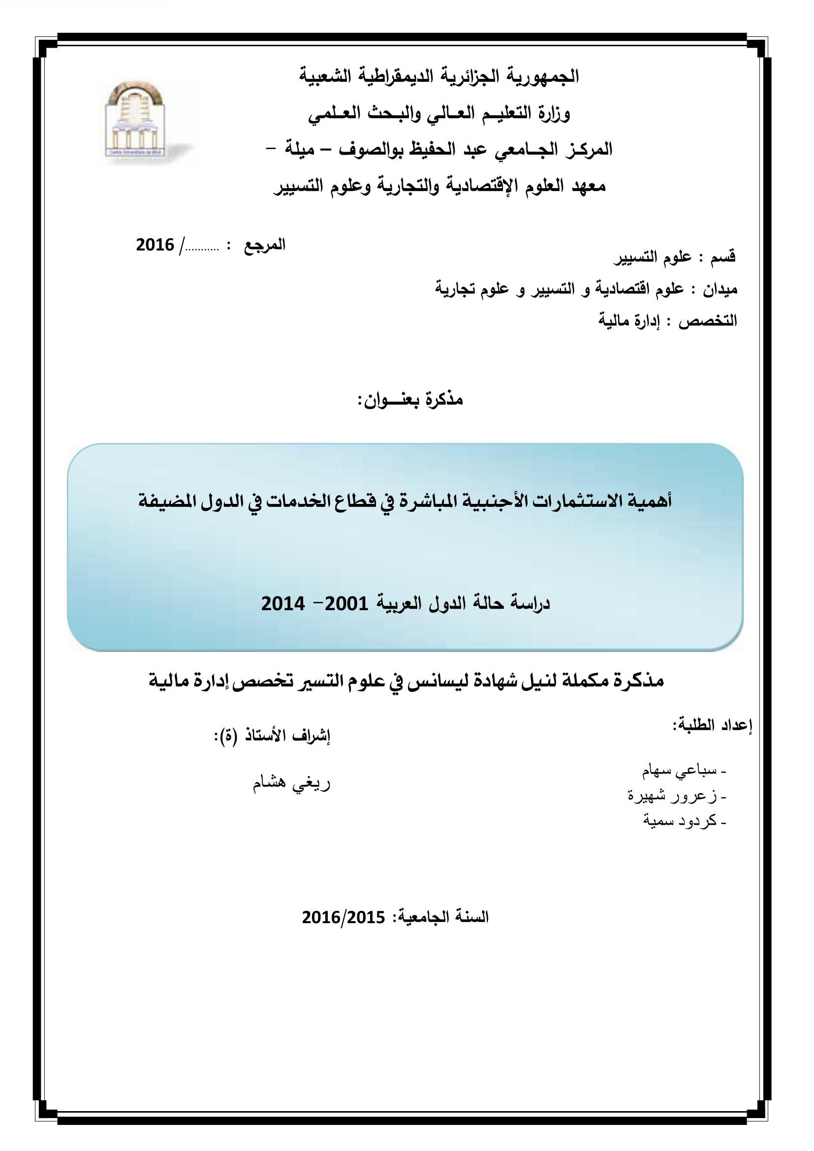 سباعي سهام & ريغي هشام (مشرفا) (2016). أهمية الإستثمارات الأجنبية المباشرة في قطاع الخدمات في الدول المضيفة : دراسة حالة الدول العربية 2001-2014.